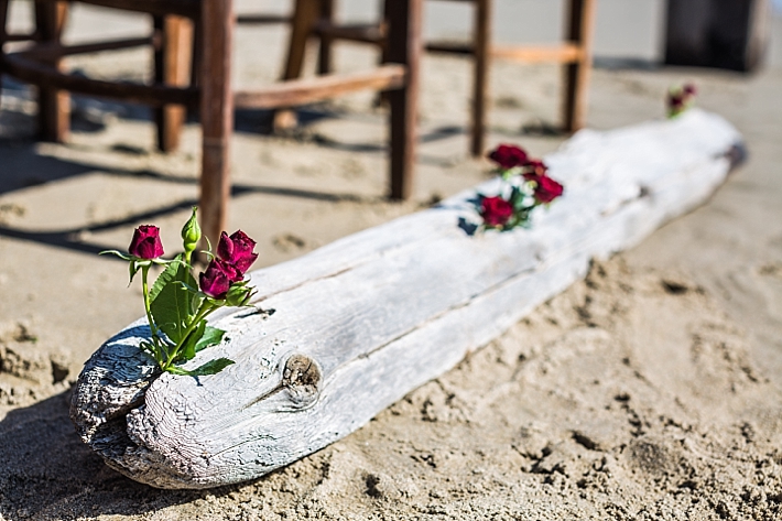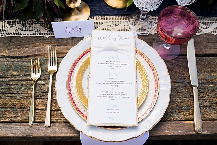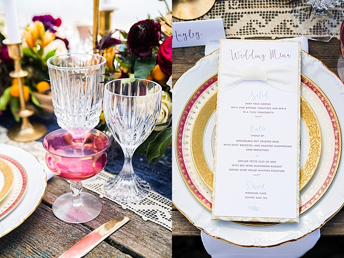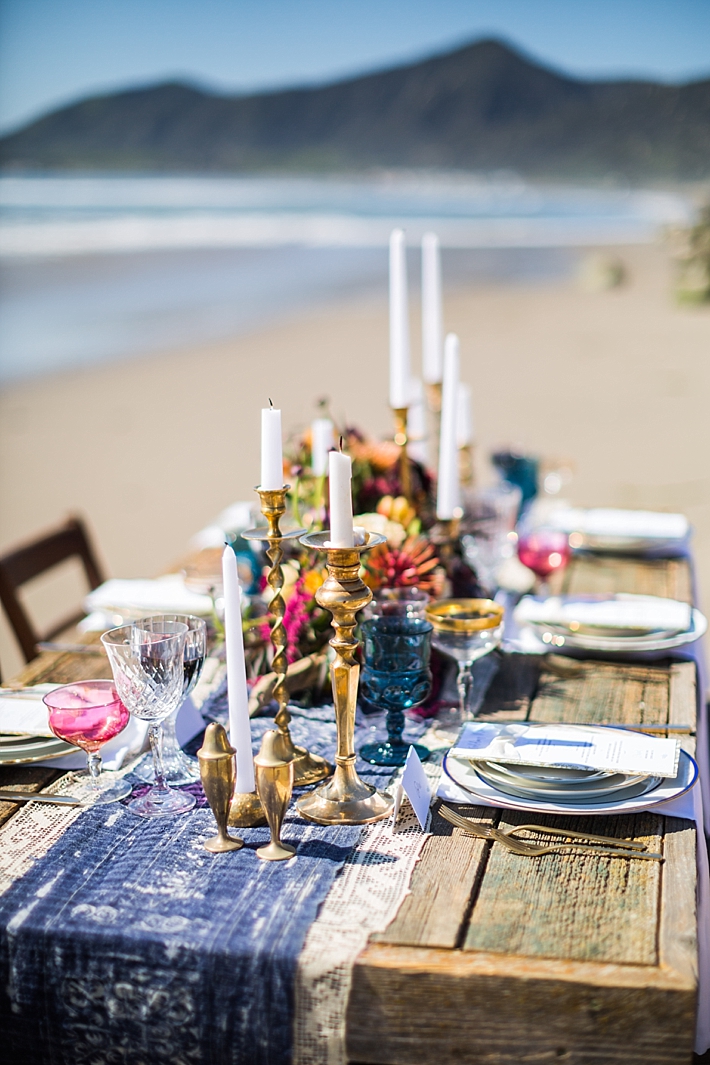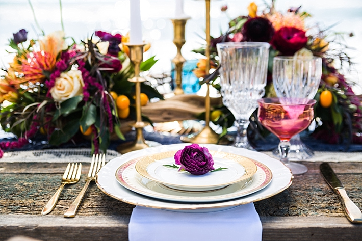 The couple’s vision was implemented by first incorporating pieces of furniture and decor that were in keeping with the beach aesthetic; tables handcrafted of vintage wood, aisle runners of natural driftwood, and an arbor as light in design as the beach air behind it. Next, the scenes were softened with vintage place settings; a beautifully eclectic mixture of cut glass goblets, gold trimmed champagne coupes, stacked china and brass candlesticks, all accented by gold flatware. The place settings were accompanied by name and menu cards, set on gold and ivory paper and finished with a soft, textured bow.