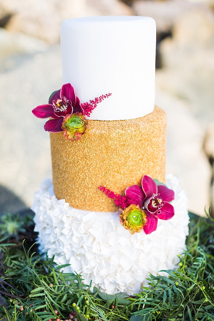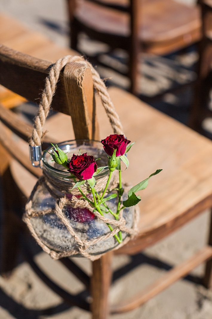 For both the ceremony and reception, lush floral arrangements were created, adding a colorful backdrop to an otherwise muted beach palate. It was important to the couple that each arrangement retain a natural look while simultaneously drawing together their color palate of marsala, peach, and indigo blue. To end the night, the couple reveled in their three-tiered cake, specifically designed with each layer encompassing an aspect of their vision- beach romance, vintage aesthetic, and a salute to the red, white, and blue.” –Smith & Murphy Events and Design House