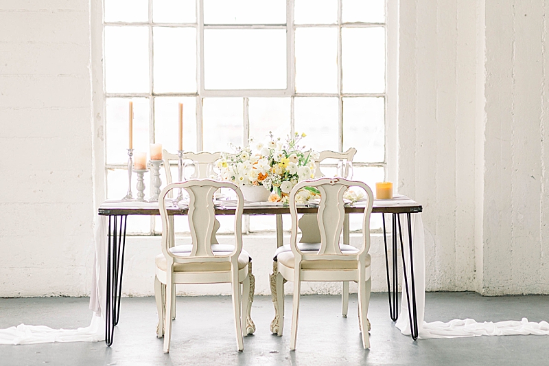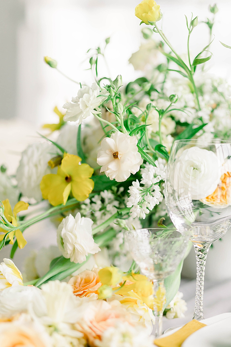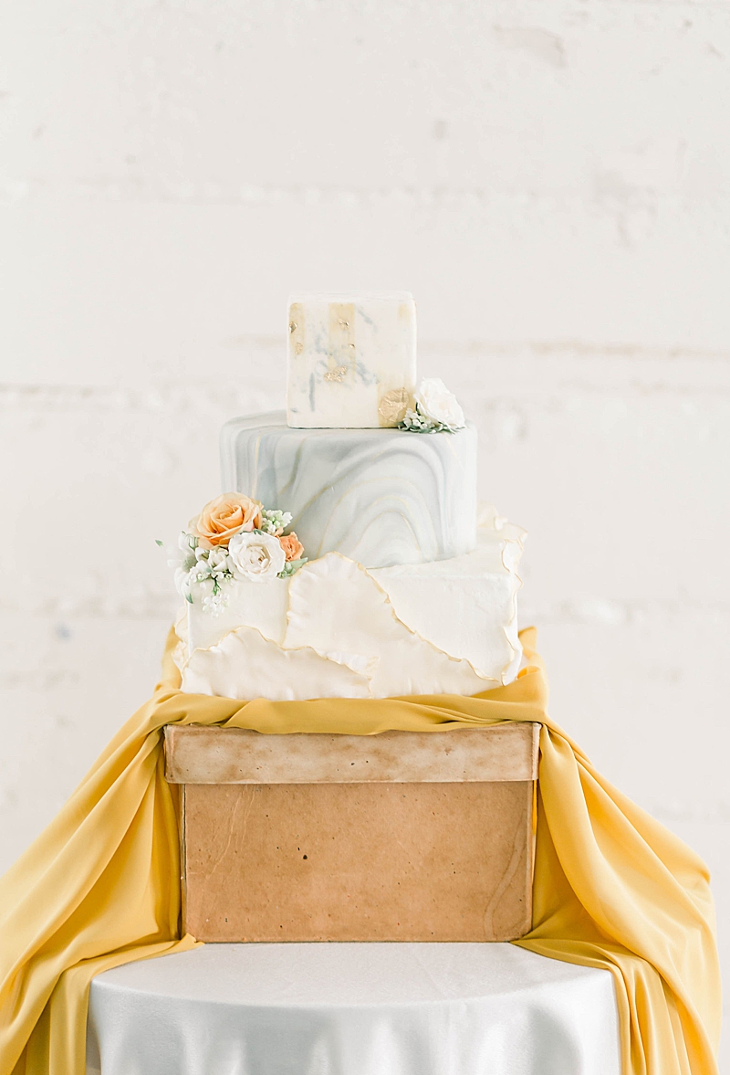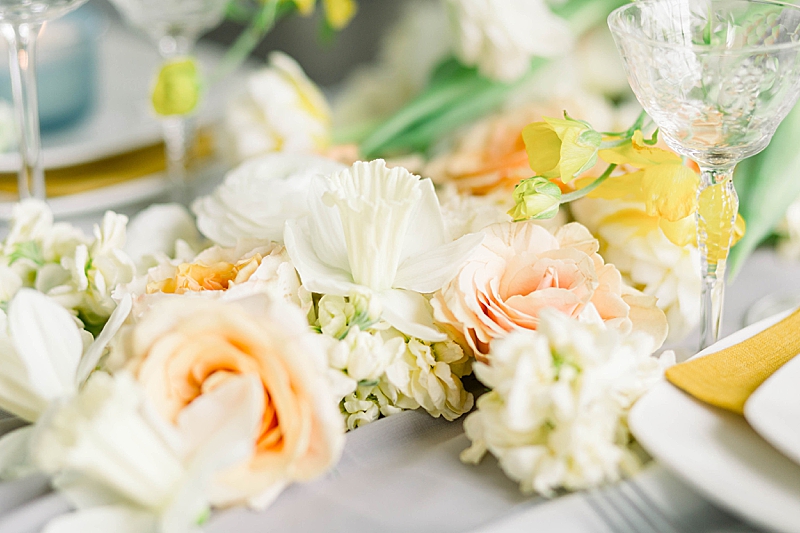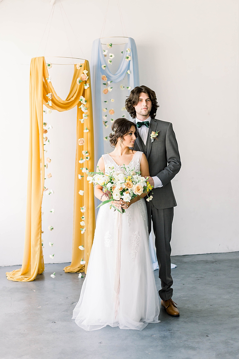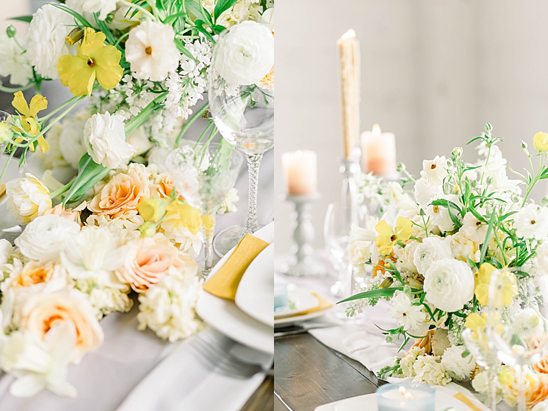 “This shoot was inspired by spring. We focused on mustard yellows and dusty blues as well as ivory and gray. We wanted to create an elegant yet vibrant shoot. The florals were gorgeous with tons of yellows, whites, greens an ivory colors. The floral installation was simple, elegant and detailed with the florals hanging down. The cake was 3 tiers and each very different. There were gold pieces, marble designs, and florals. This was the perfect mix. The table included one overflowing centerpiece, simple and clean plates and candles to fill it with elegance.”