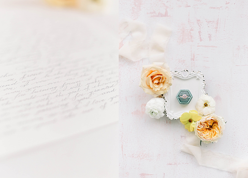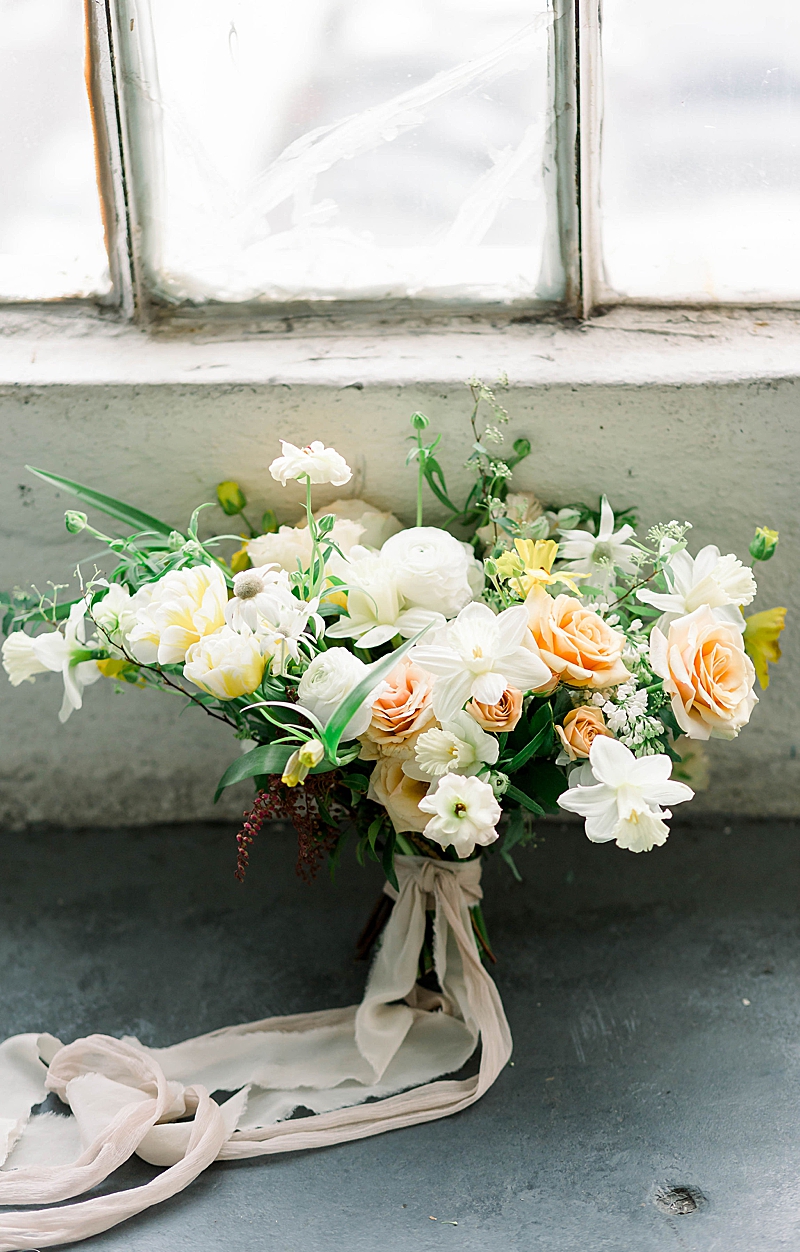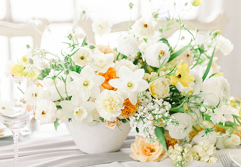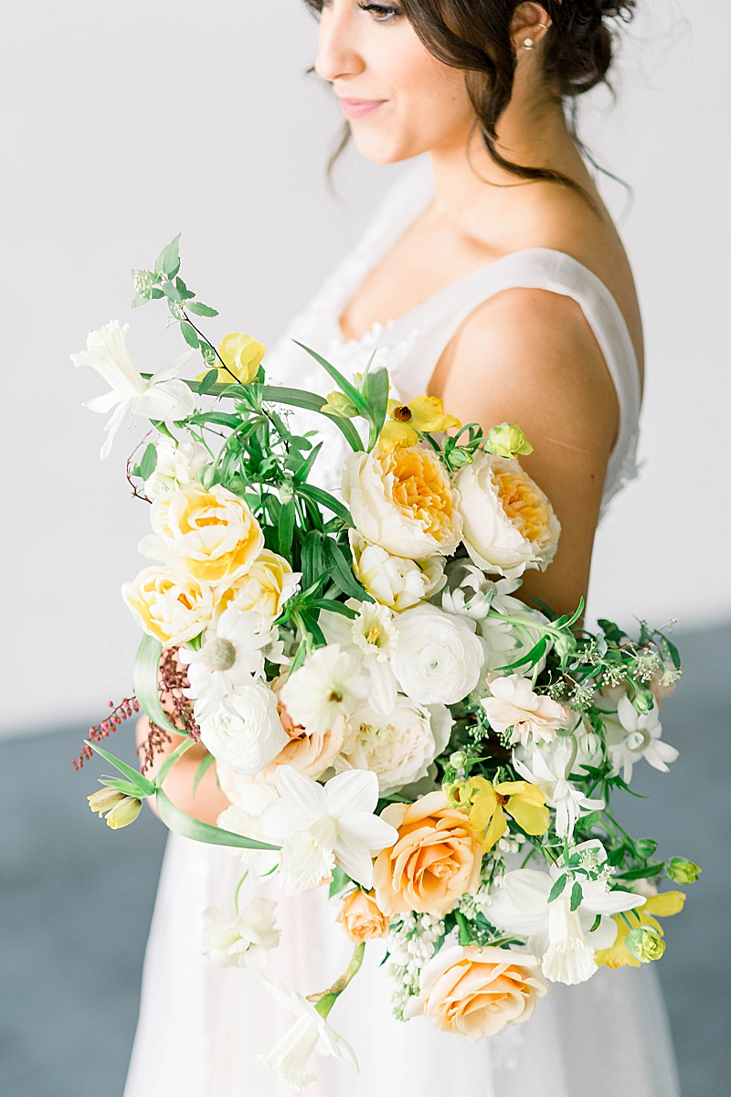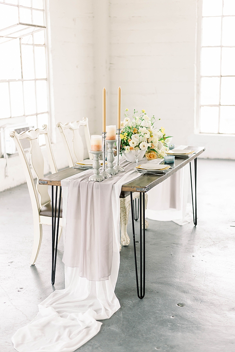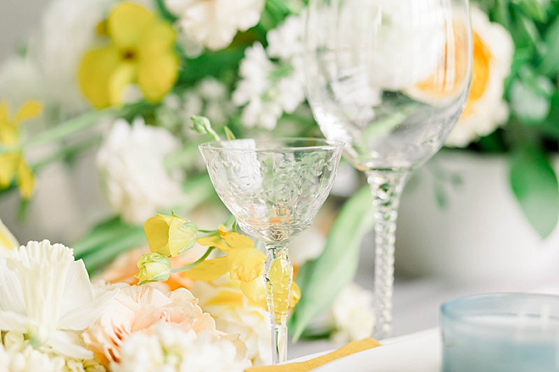 “This shoot was inspired by spring. We focused on mustard yellows and dusty blues as well as ivory and gray. We wanted to create an elegant yet vibrant shoot. The florals were gorgeous with tons of yellows, whites, greens an ivory colors. The floral installation was simple, elegant and detailed with the florals hanging down. The cake was 3 tiers and each very different. There were gold pieces, marble designs, and florals. This was the perfect mix. The table included one overflowing centerpiece, simple and clean plates and candles to fill it with elegance.”