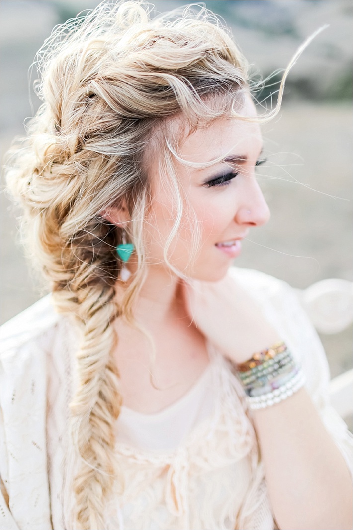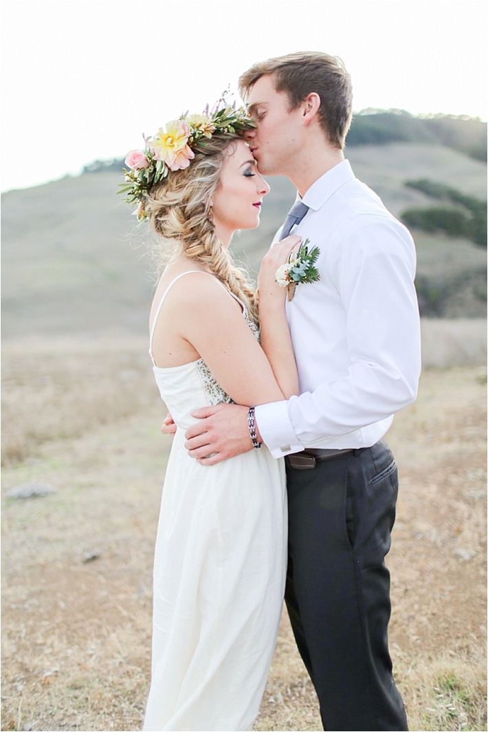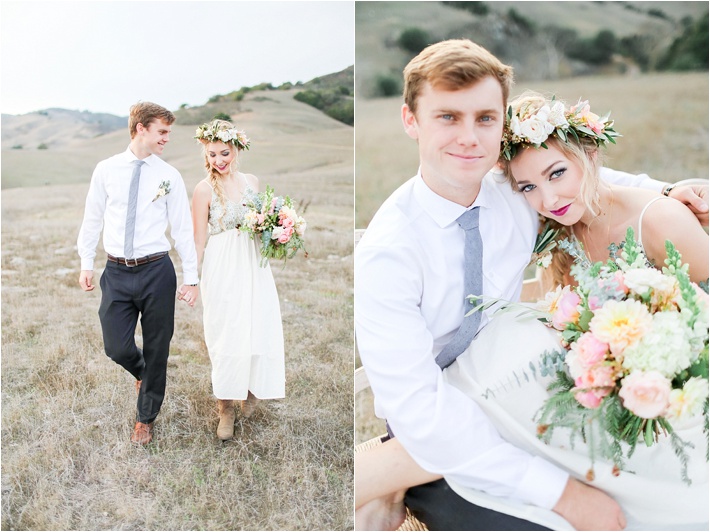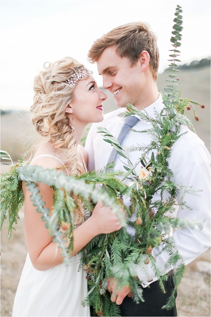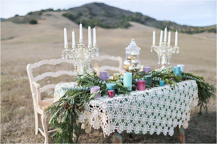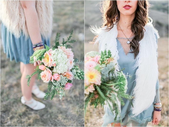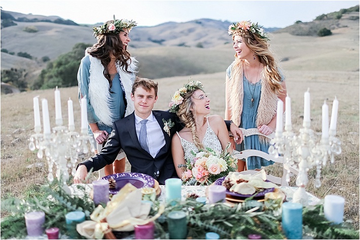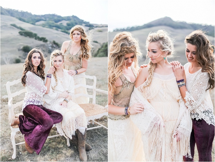 About this shoot: “I wanted to capture a bohemian-esque vibe, while keeping in mind inspiration for the winter season. Taking place on a captivating golden hill top in San Luis Obispo, this shoot couldn’t have been any more intimate & enchanting. I incorporated subtle touches of winter: faux-fur vests, pine cones for the table, cinnamon sticks for plate decor, burly wood & gold for the chargers, gold christmas bulbs, and some dark blue winter greens into the floral work. Cool colored candles cover the table, providing a charming, natural, bohemian feel. {I received so many awesome pieces from multiple vendors, that it was difficult to shoot it all – what a wonderful challenge to have!} The styled shoot has a story-like timeline: in the beginning, there are the “getting ready” images that portray the more casual {yet beautiful} RAGA clothing. The bridesmaids dressed in embellished tops and velvet plum pants; the bride in a one of a kind 1970’s vintage ivory kimono jacket. Then, the “wedding attire:” which includes the blue bridesmaid dresses, fur vests, gem stone jewelry, & soft flower crowns, and finally, the “after-party/reception” look, which incorporates the evergreen wraps, white dresses, and the glamorous & bold {yet simple} Kennedy, Leslie, & Lafayette head pieces by Untamed Petals.
