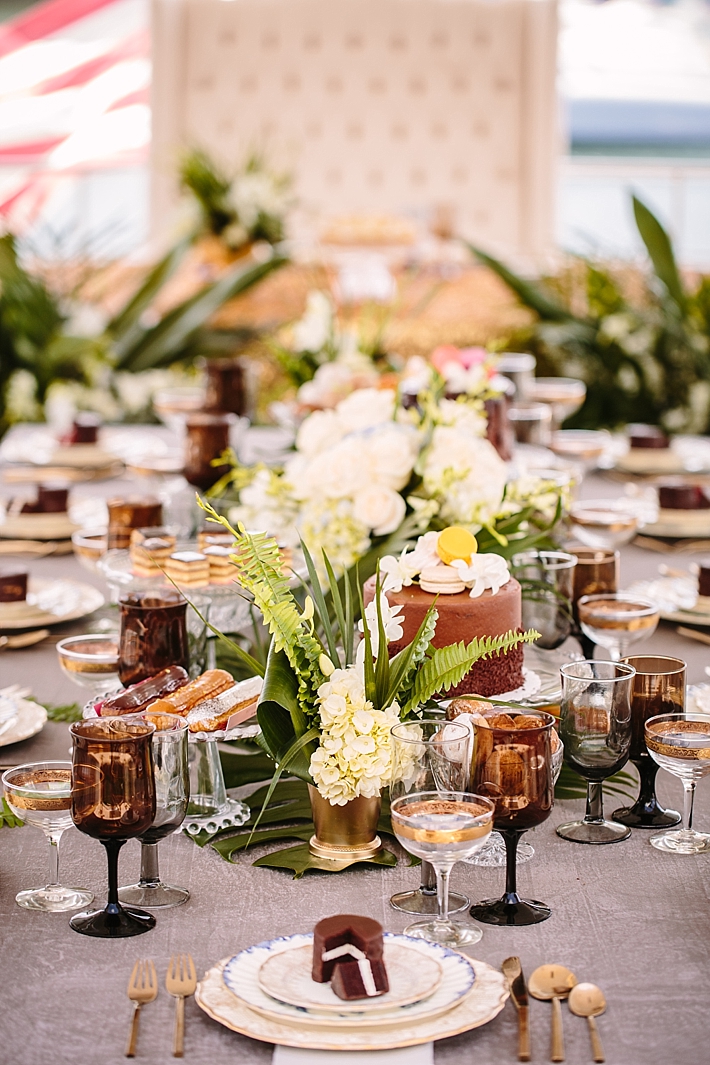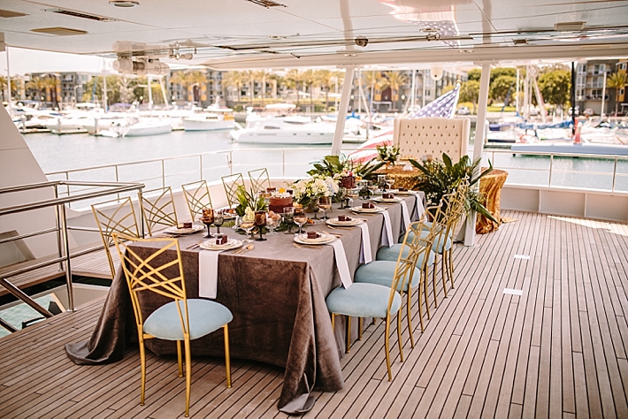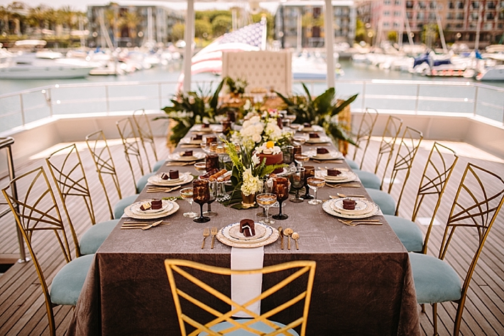 Yachts are a fun and unique way to host your wedding or intimate event! Today’s feature shows us just that! More about today’s feature from the team: “This styled shoot turned networking event took place on the Leight Star Yacht – a new wedding and event venue! Inspired by the 1920s feel of the yacht‘s interior, the designers created a modern Great Gatsby feel with the setup and decor. A delicious catering menu was created to reflect the 1920s with a modern twist, with classic cocktails and modern dishes to balance old and new. They softened the color palette of the rich tones of the 1920s with grays and blues, but kept it luxe with rich fabrics like velvet and elegant place settings. The setup was designed to stage the yacht to capture how a wedding can be hosted on board, with a ceremony on the helipad and a reception on the main deck. After the shoot, top Los Angeles wedding and corporate planners gathered to enjoy the decor, view, and amazing weather!”