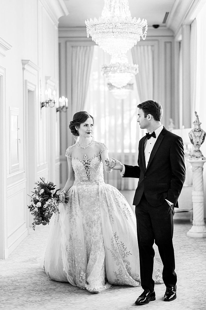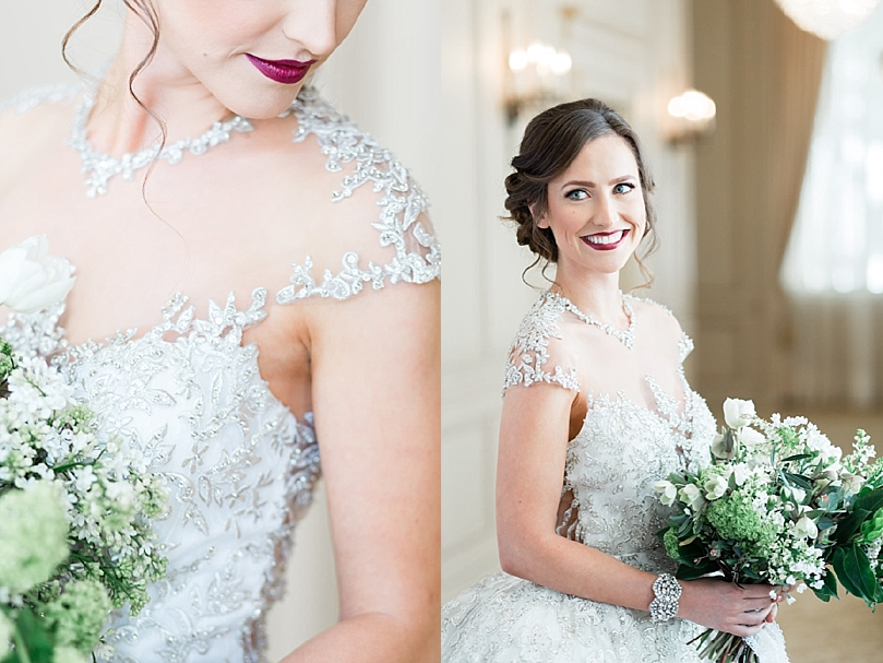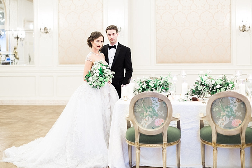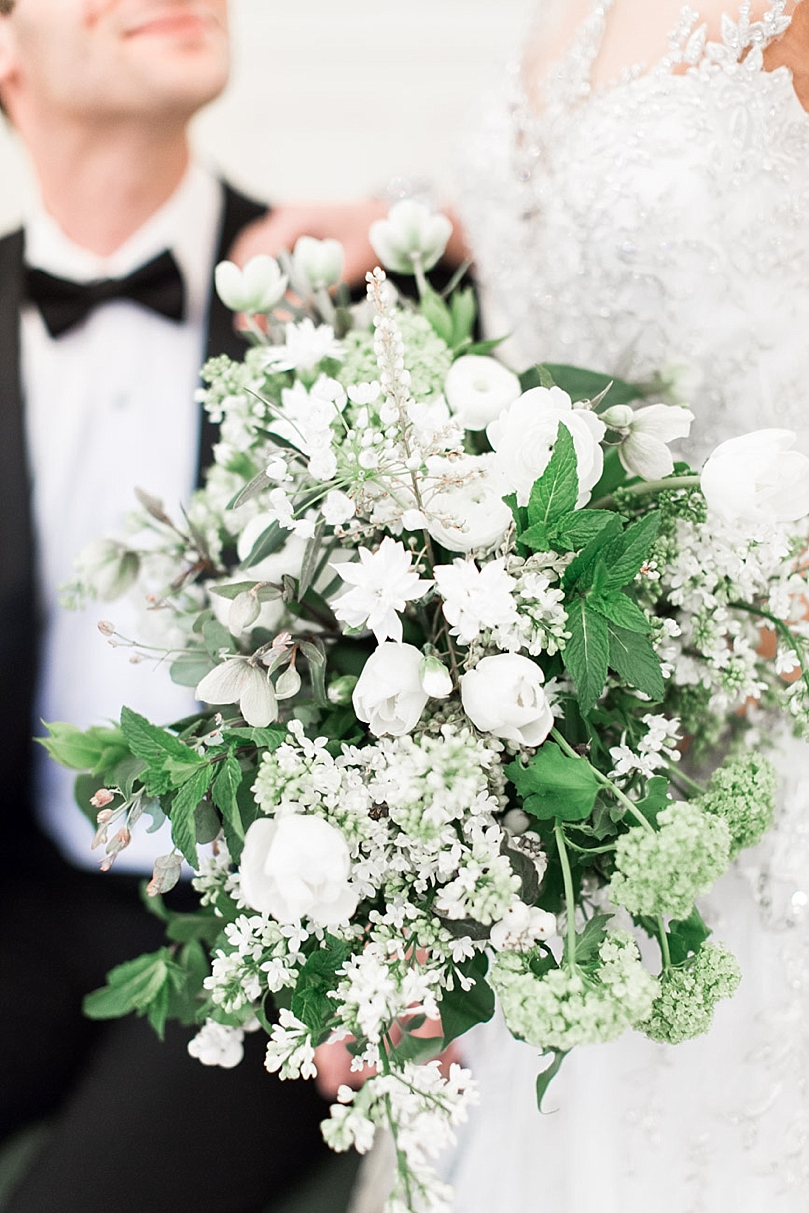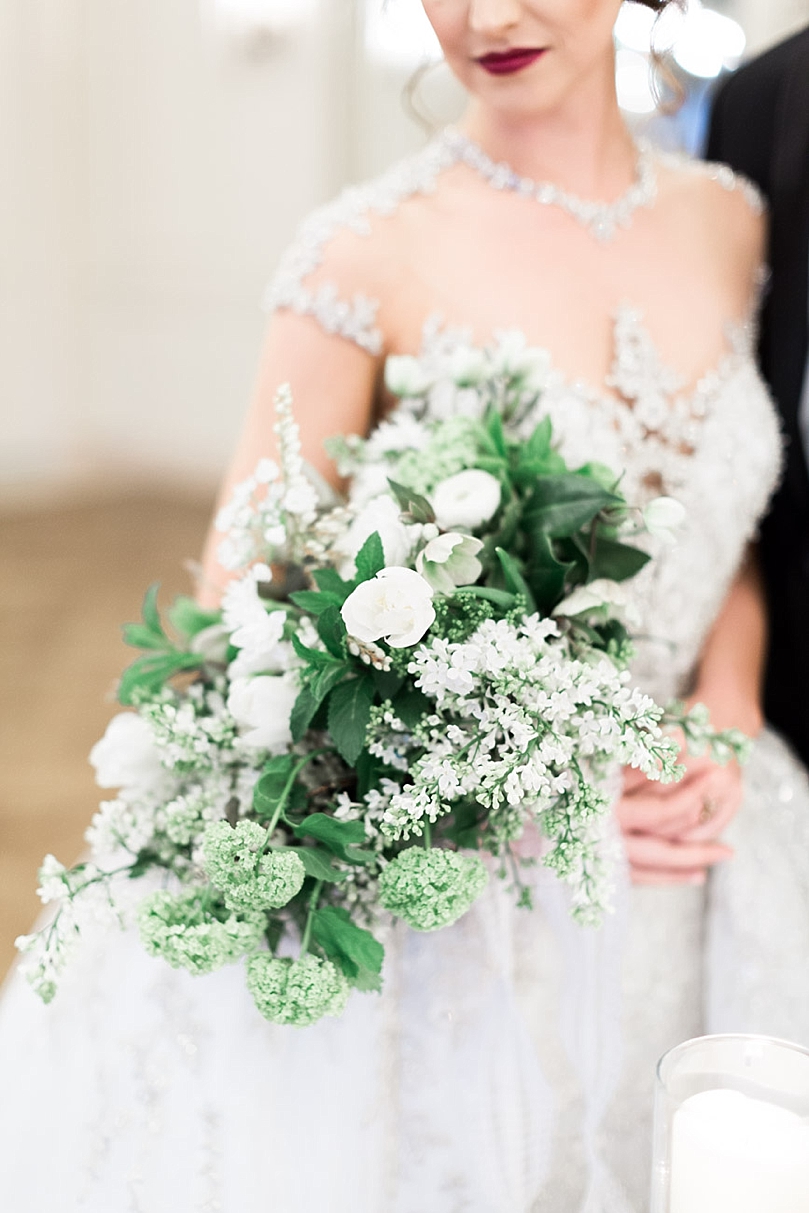 Breesa’s lush green and white floral arrangements gave the table a full look that conveyed just enough opulence for a royal wedding without looking excessive. The shape of Diana’s cascading white and green bouquet inspired the bridal bouquet she created for our bride who donned a gorgeous YSA Makino gown that was truly out of this world.
