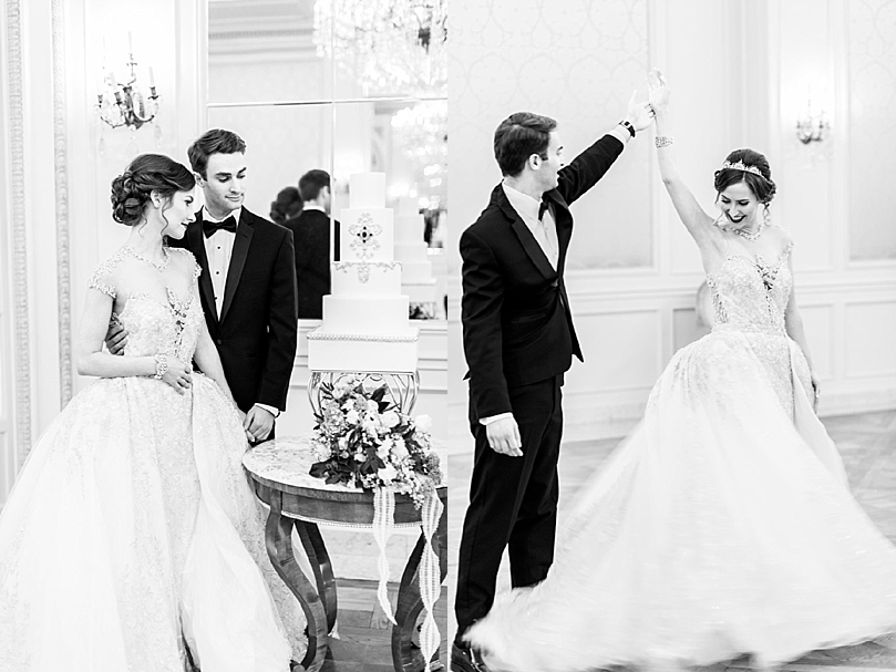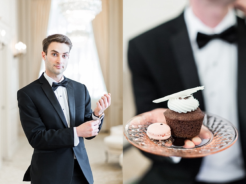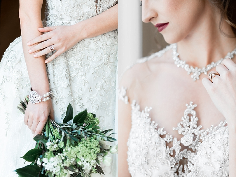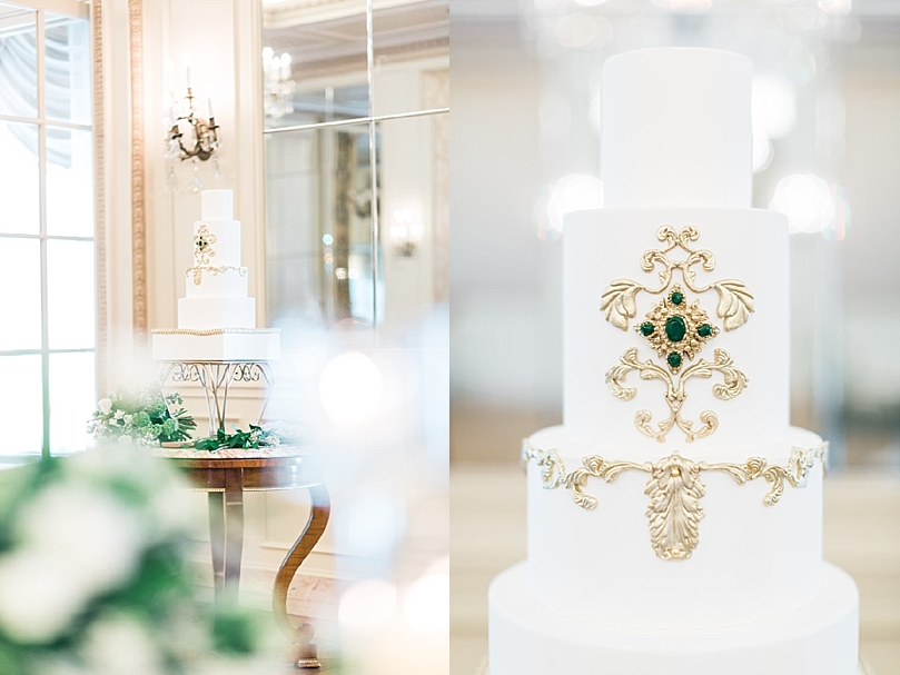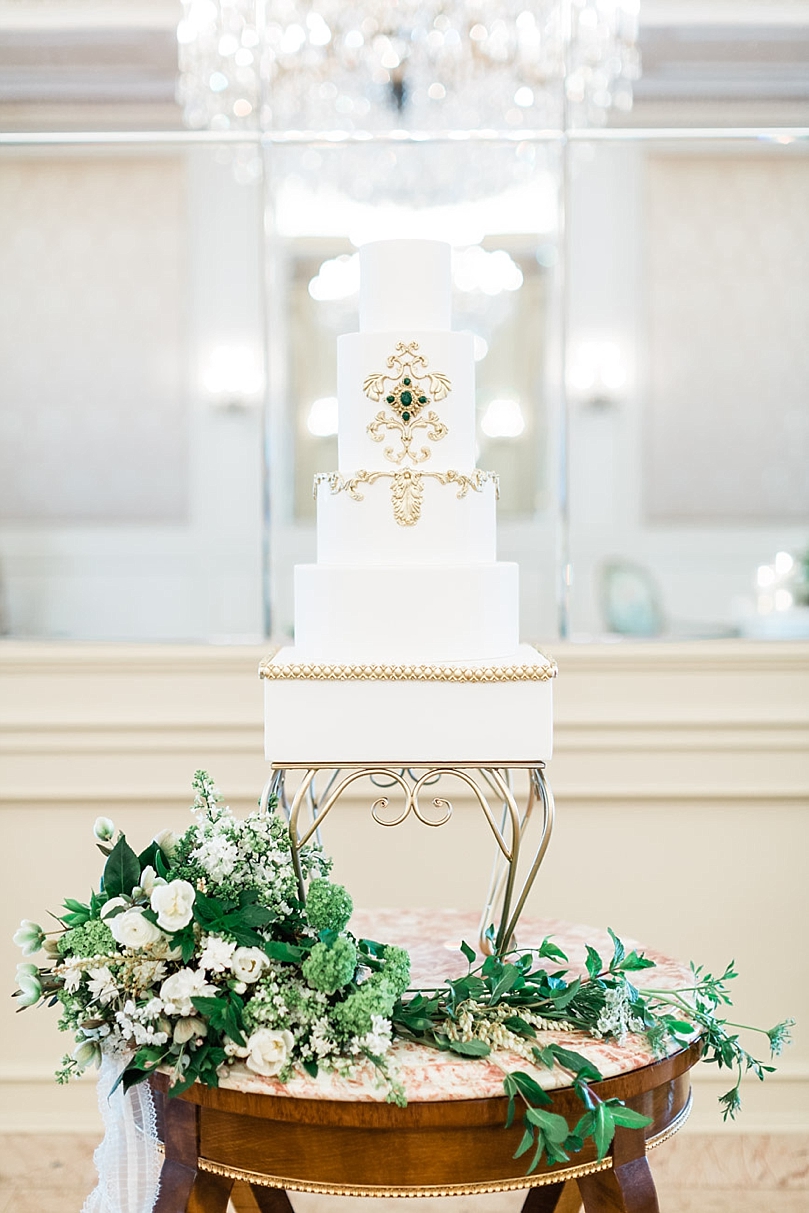 For the cake, Sweet Cheeks created a five-tier masterpiece that featured a square bottom tier and successive round tiers. Gold detailing, inspired by one of Elizabeth’s crowns, framed the beautiful elements of emerald within the cake. What brides would love about this cake is that is simple, yet exquisite. For this shoot, royal and luxury did not equate to excess, but rather well intentioned designs that would be adored by lovers of traditional regal elegance.” -Cavin Elizabeth Photography