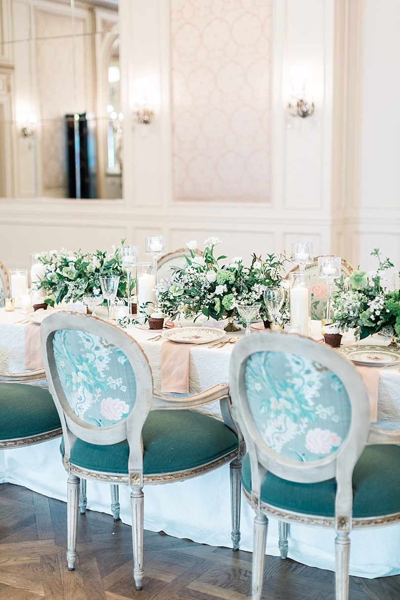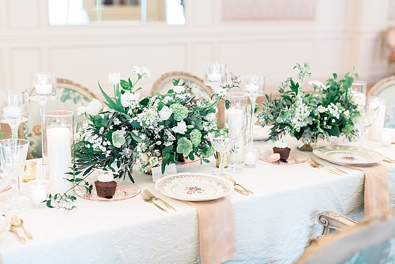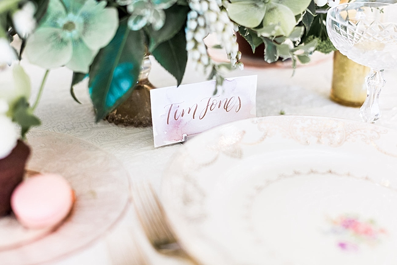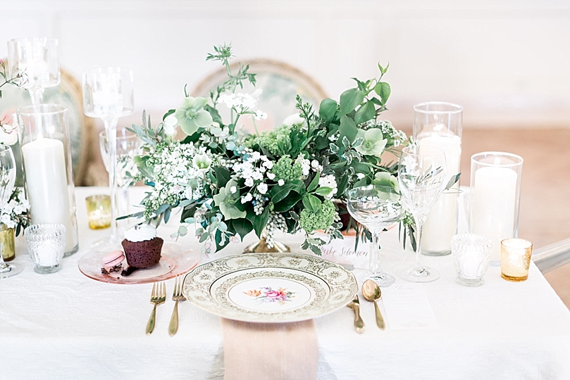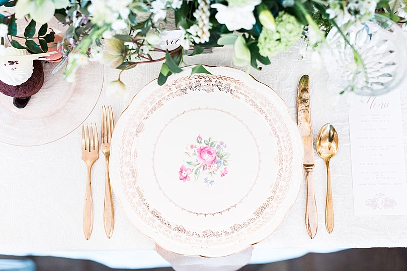 For the table settings, stylist Cara North of Luxe Events chose beautiful floral print china to complement the gorgeous green chairs and textured linens. A cupcake and macaron graced a rose gold plate for each setting.
