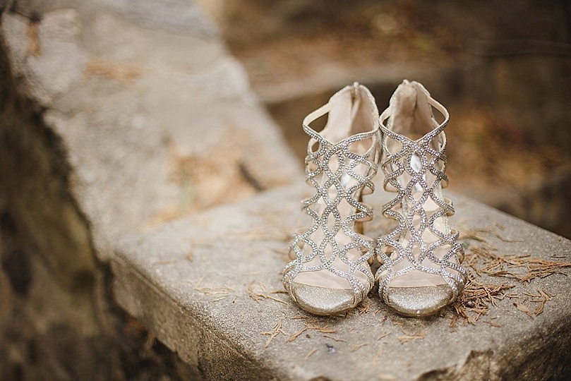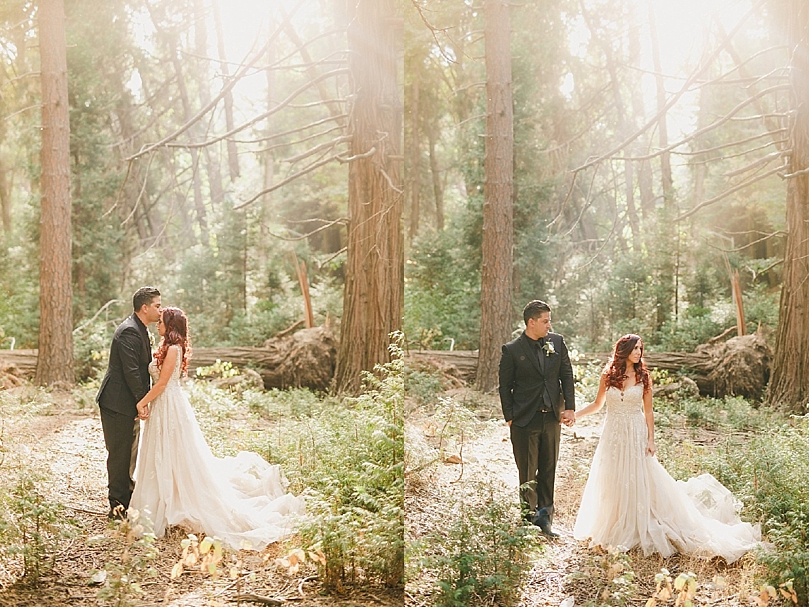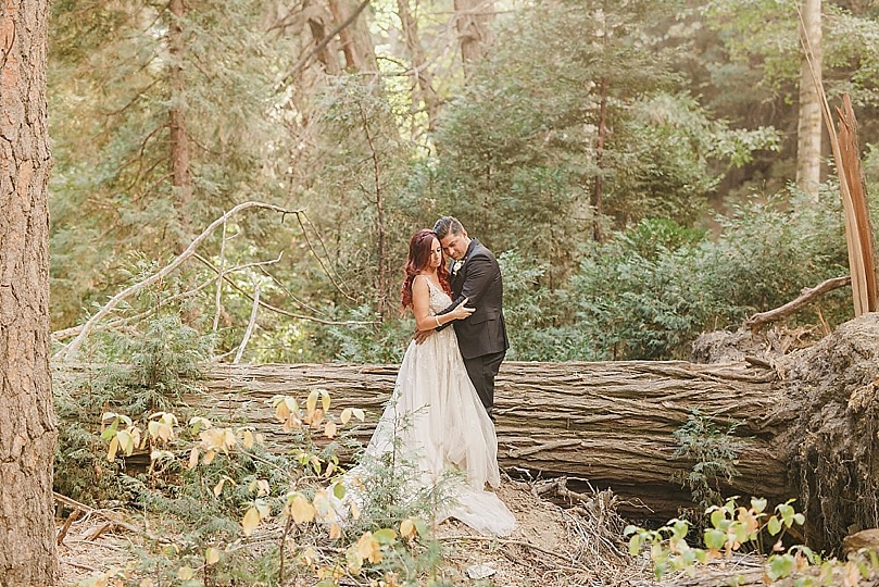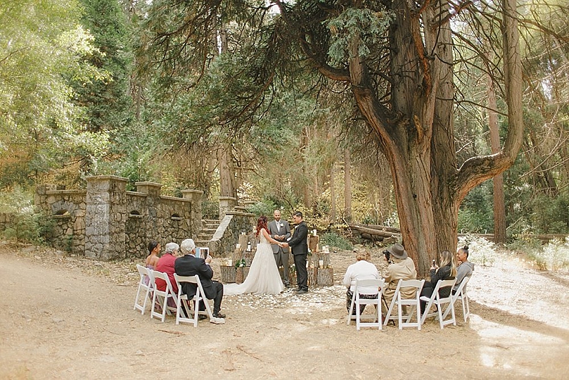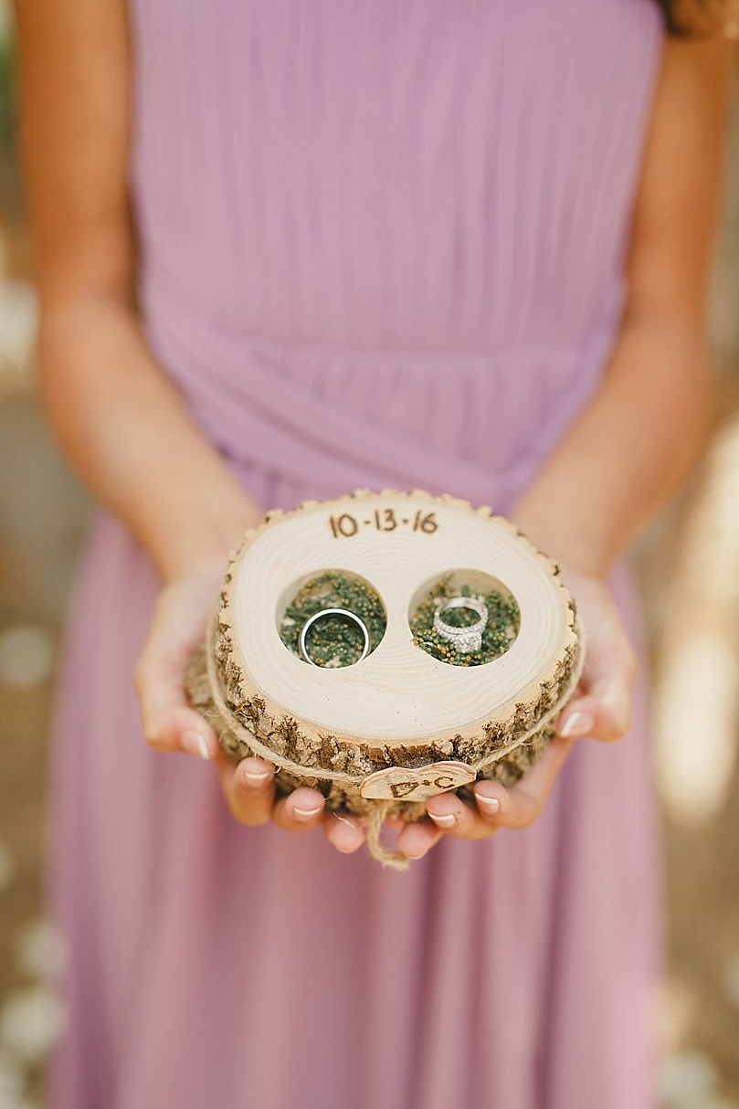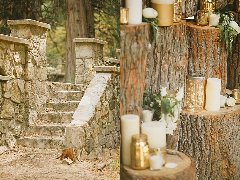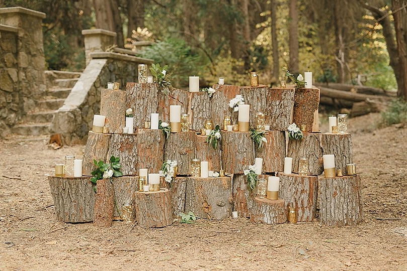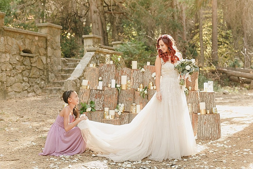 “With only 8 of their closest friends and family members in attendance, Chantal and Dan said “I Do” in a scene straight from a fairytale! They dressed up this magical little spot in the woods, with a custom tree trunk backdrop and some personal accents. Simple. but enchanted. The gorgeous flower girl is the bride’s daughter.” -Kristen Booth Photography