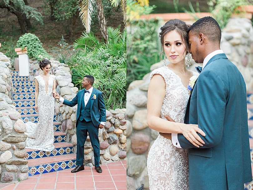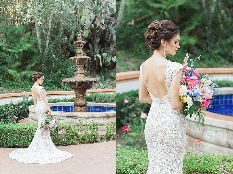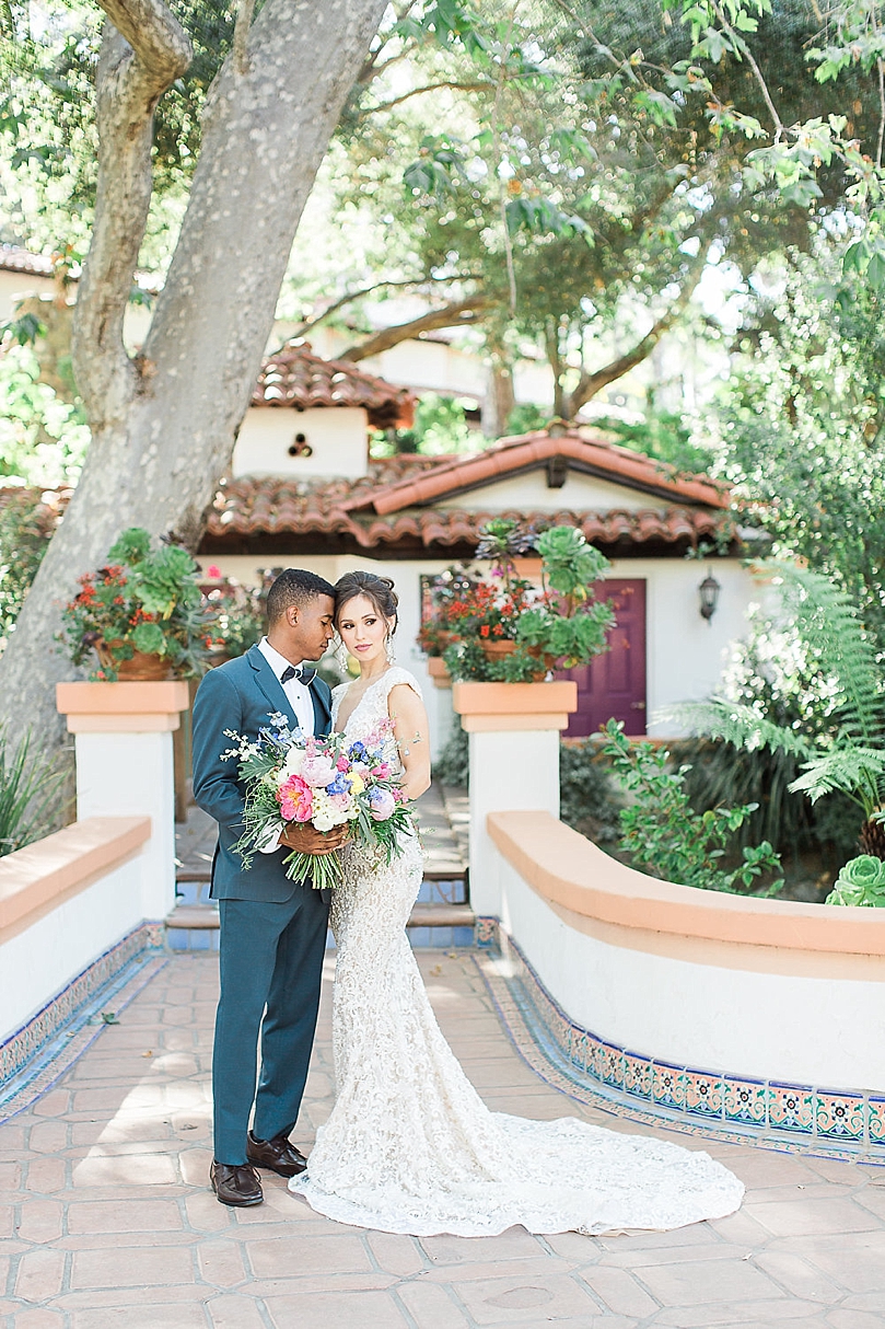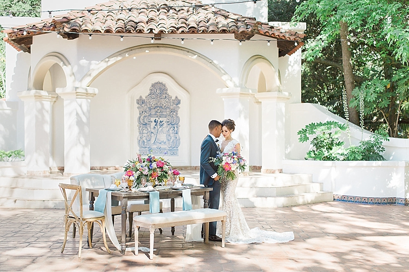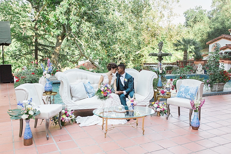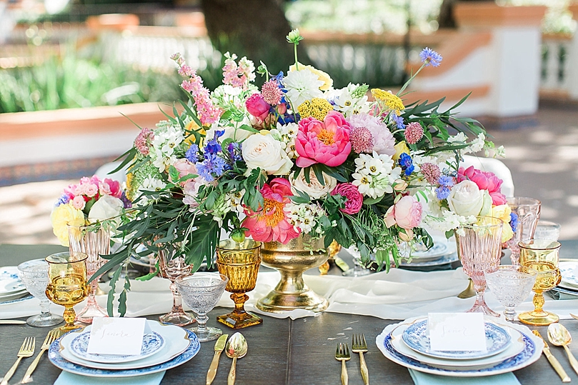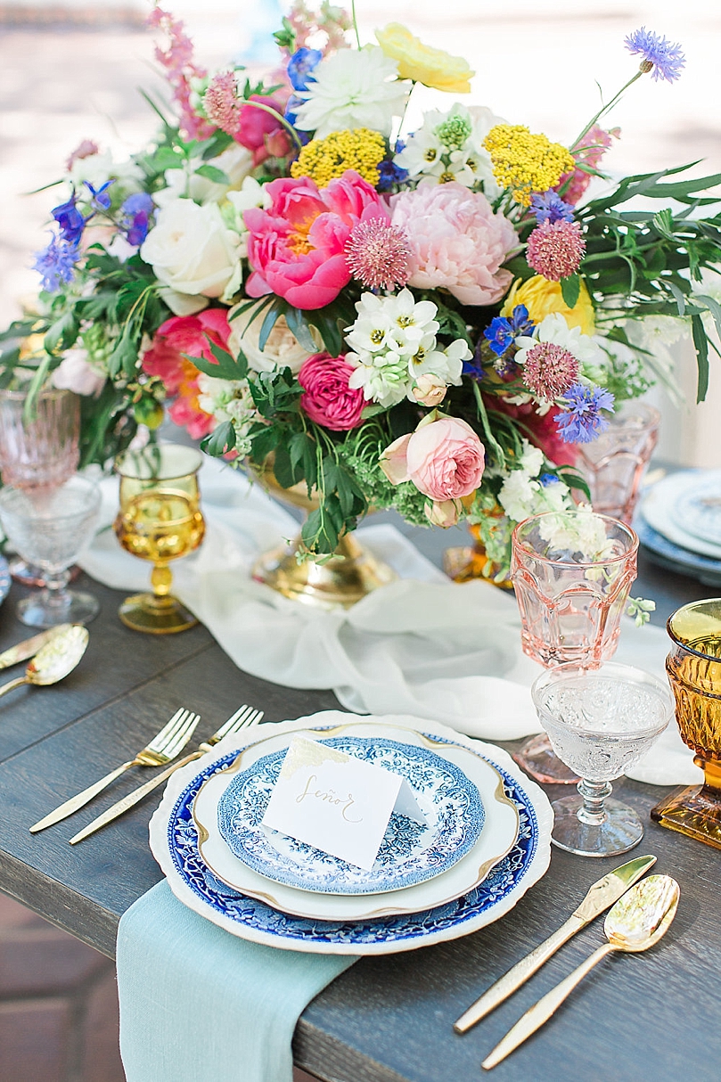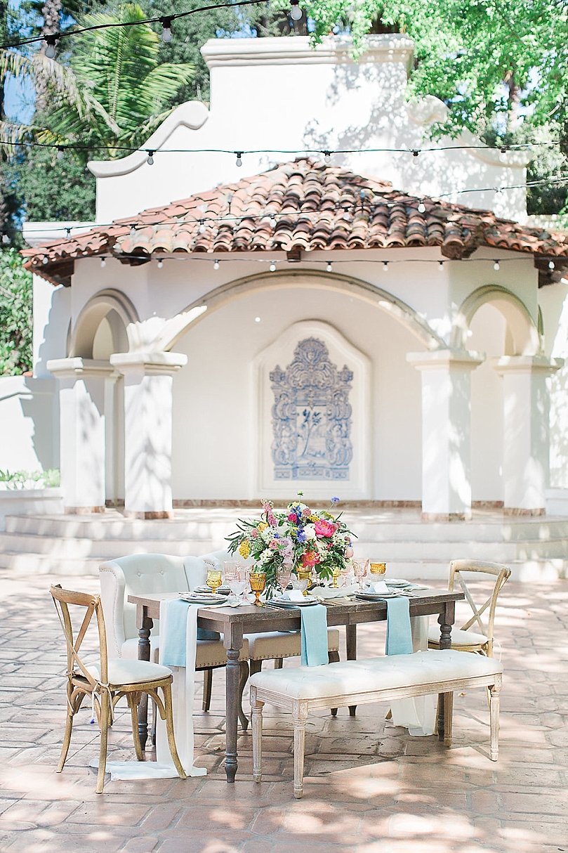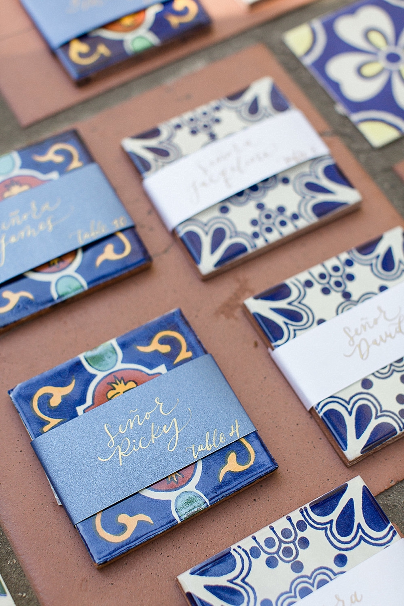 “For this shoot our venue was our muse. Nestled in the foothills of southern California Rancho Las Lomas is a beautiful Spanish style oasis. We drew inspiration from the architecture and tiles, which we loved incorporating into the vision. Not only did we highlight the tiles on property, we added our own tiles in the form of escort cards, with gold calligraphy by Kelly Patrice.