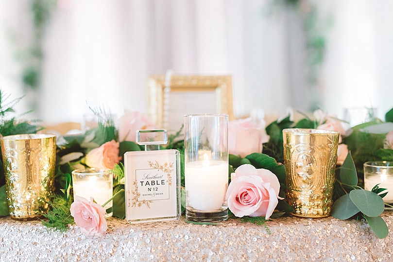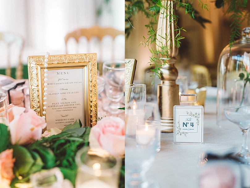 The perfume bottle table numbers designed by Jasmin Michelle Designs paired perfectly with the draping pearl
