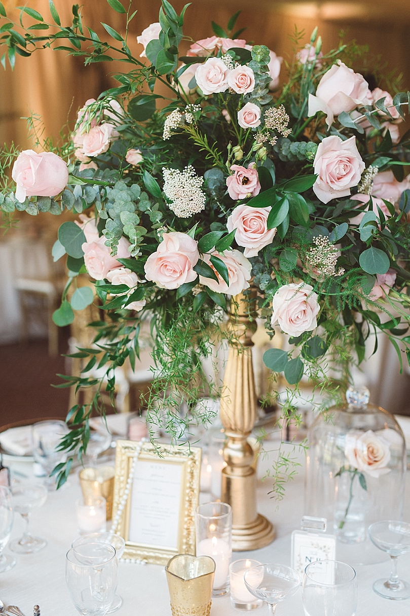 accents hanging off the baroque style frame menu. Stella Blooms Design beautiful centerpieces were accented with