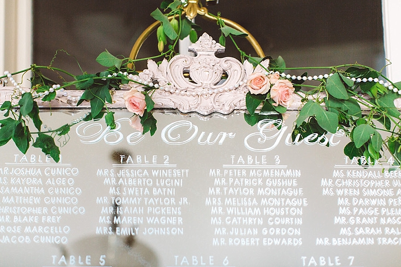 and the Beast. The guests were greeted at the venue with a escort card decal mirror with the saying ‘Be Our Guest’.