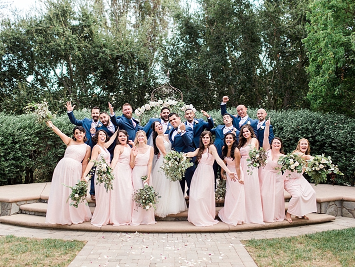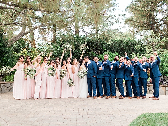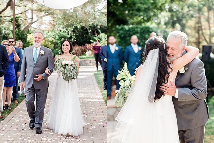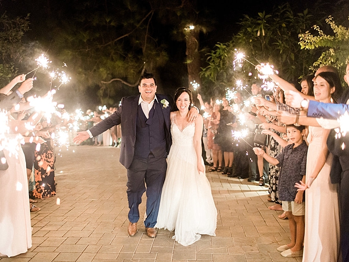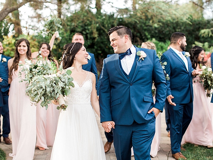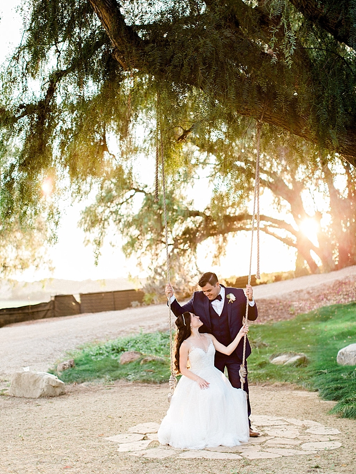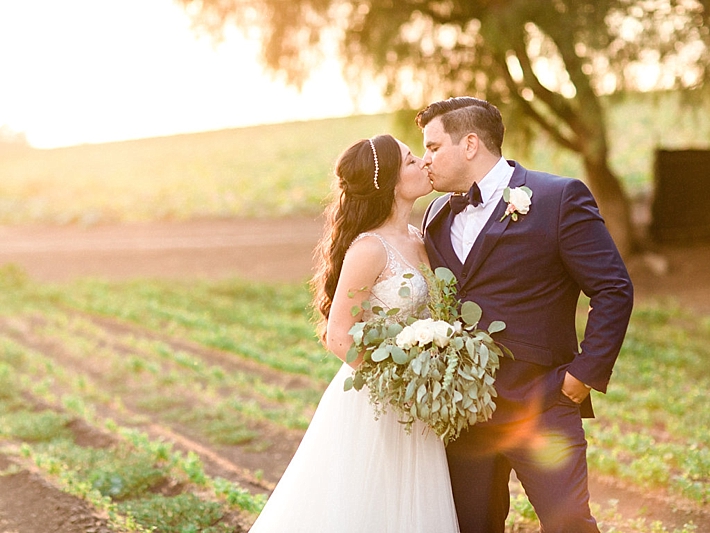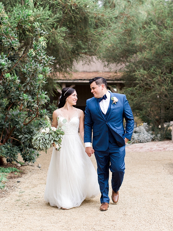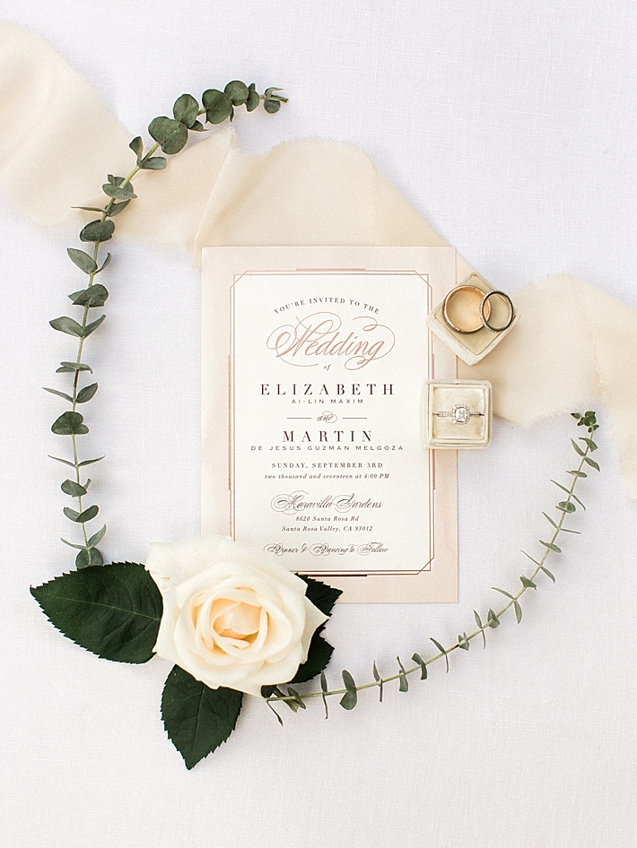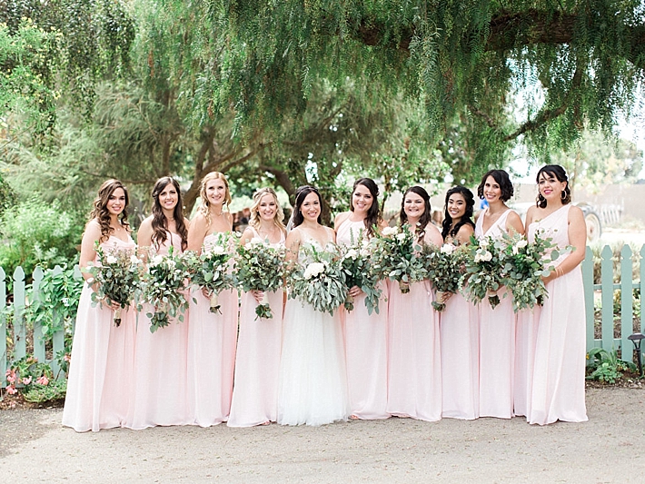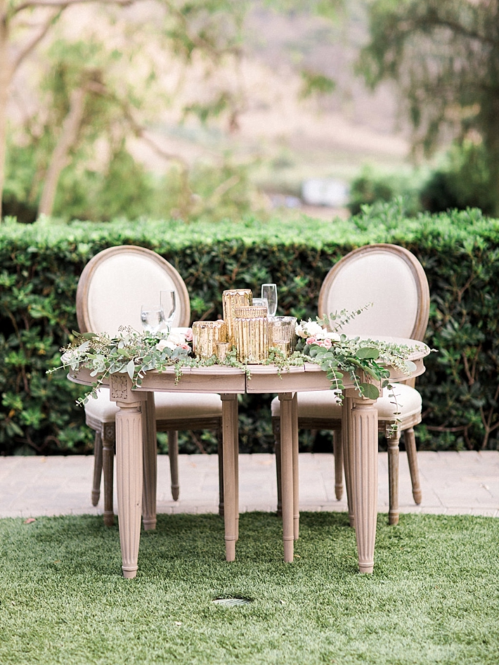 “Our wedding was a romantic, bohemian, garden-chic celebration, blending our favorite things and Martin’s Mexican heritage into one big, fun party! It was at Maravilla Gardens in Camarillo, CA, which is a gorgeous outdoor garden venue overlooking fields. Our decor was pale pink and lots of greenery. Instead of arrangements with flowers only, our decorator, Emi Goleta, used two types of eucalyptus and acacia leaves. The tables were topped with hoops of greenery and gold votives. The venue is so gorgeous, we wanted to keep the decor understated and elegant.” -Bride & Groom