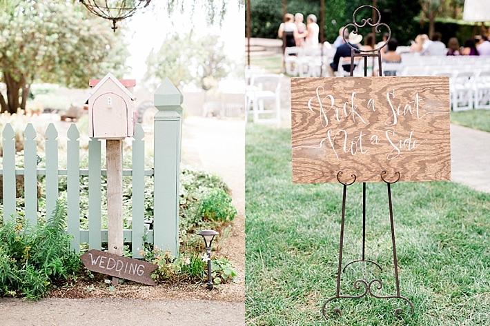 My friend Emi Goleta, who is a visual merchandiser at Anthropologie, designed all the decor herself! Everything was DIY, from the gold wreaths of greenery on the tables, to the gorgeous wooden signs telling guests to “pick a seat not a side” and listing our drink menu from calligrapher Aly Bennett. My cousin, Mei-lin, handmade the floral arch that was behind us during the ceremony! We found something that inspired us on Pinterest. We even handmade our name cards and stuck little sprigs of greenery through each one.