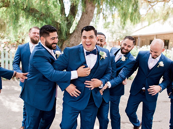 Tell us about your attire choices.My dress was elegant and romantic, to match the style of the venue. I thought I wanted a tight dress but ended up choosing something with a flowy skirt! Martin and his groomsmen wore cobalt blue suits, and my bridesmaids wore blush pink dresses. I let them all choose their own style in the same fabric, so everyone looked similar but not identical.