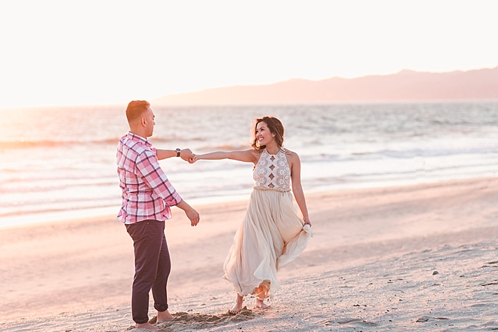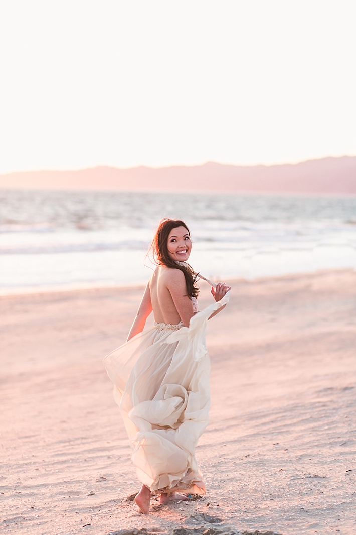 “We chose Venice Beach because it has a special meaning to us. Venice was where we celebrated Nichole’s 26th birthday, as well as our first kiss by the beach at sunset. We chose warm and nude colors to compliment the beautiful pink sunset and the sand. The wind that day was untamed, but Frances somehow caught some of the best movements of the Free People dress Nichole wore.”