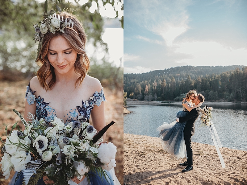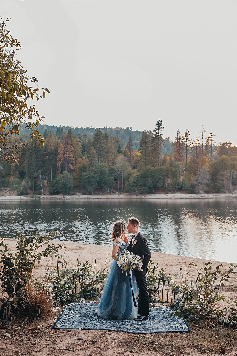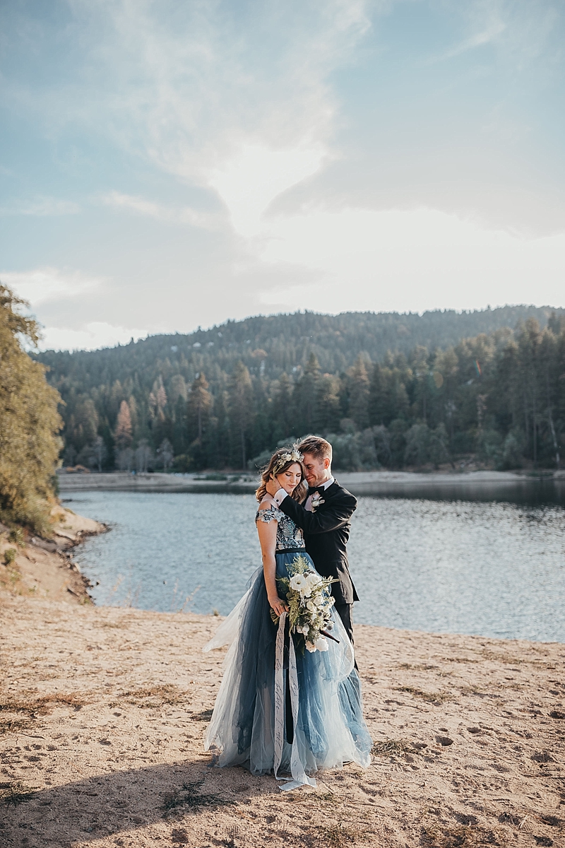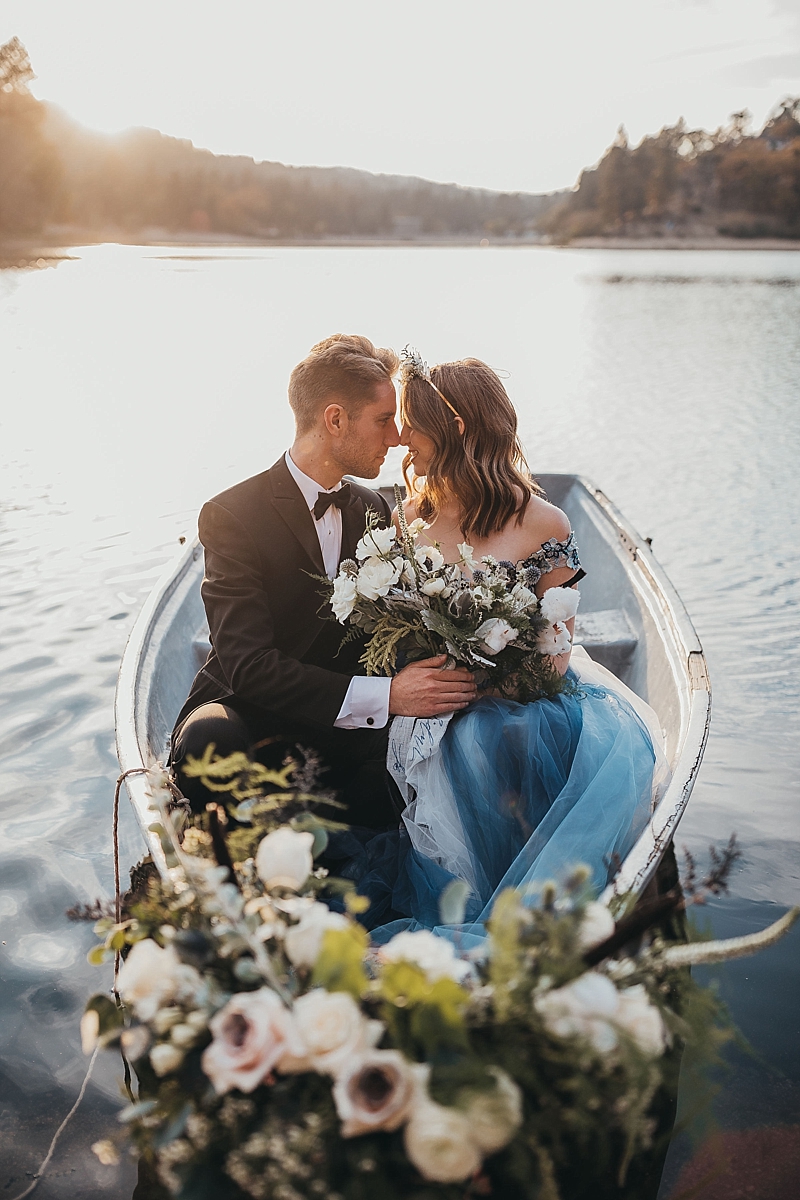 “A blue Chotronette gown inspired a beautiful lake-side elopement featuring various blue tones, a row boat, and pine tree covered coast lines. Southern California is known for its cities and beaches. This styled shoot brings you out of the city, away from the beach, and up to the mountains a short few hours away.”