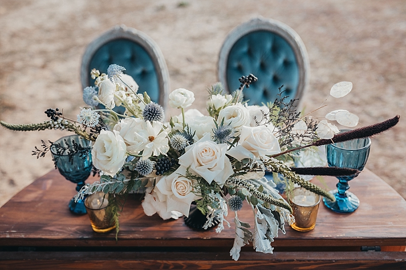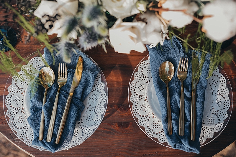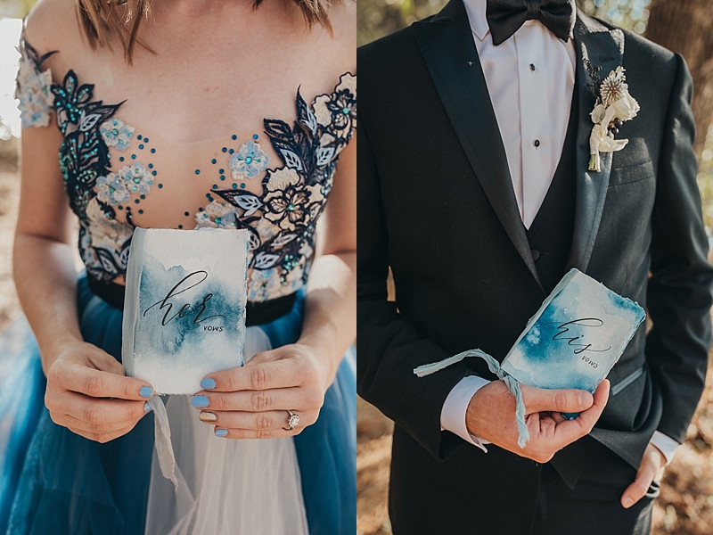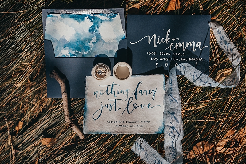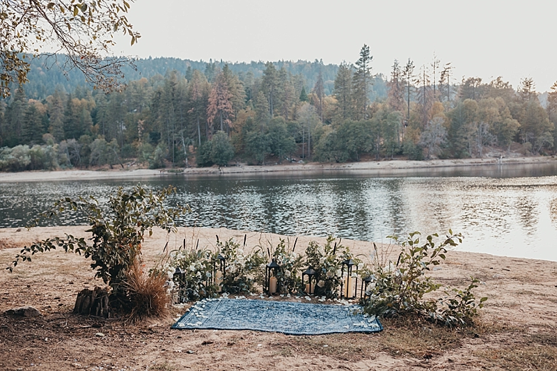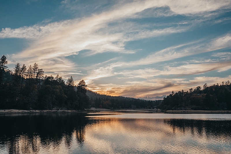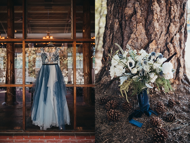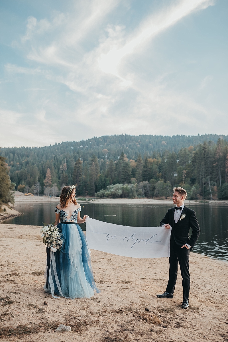 “A blue Chotronette gown inspired a beautiful lake-side elopement featuring various blue tones, a row boat, and pine tree covered coast lines. Southern California is known for its cities and beaches. This styled shoot brings you out of the city, away from the beach, and up to the mountains a short few hours away.”