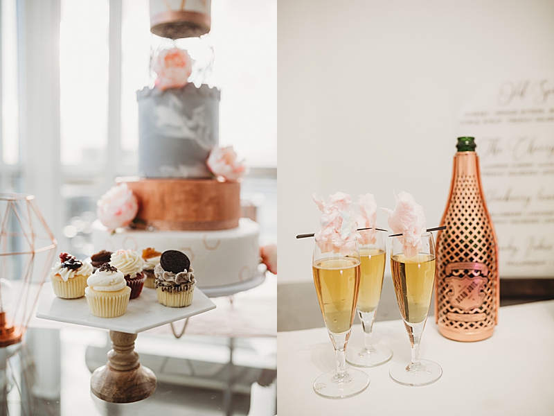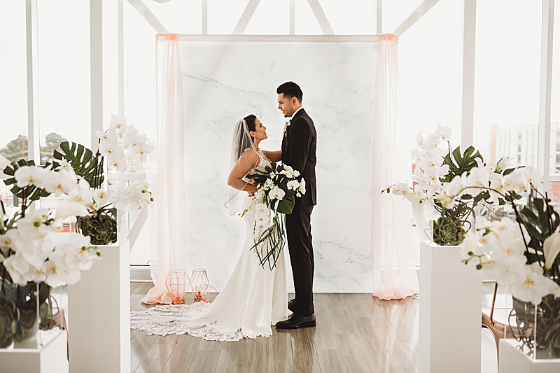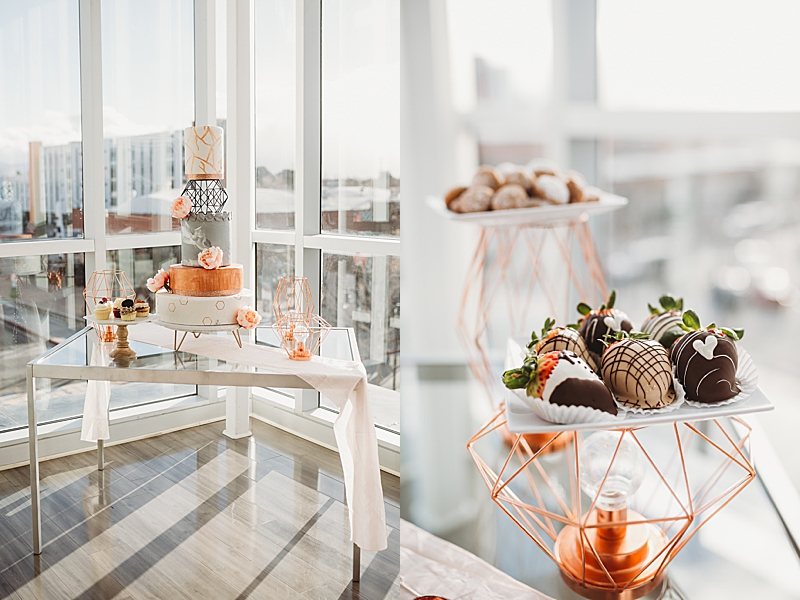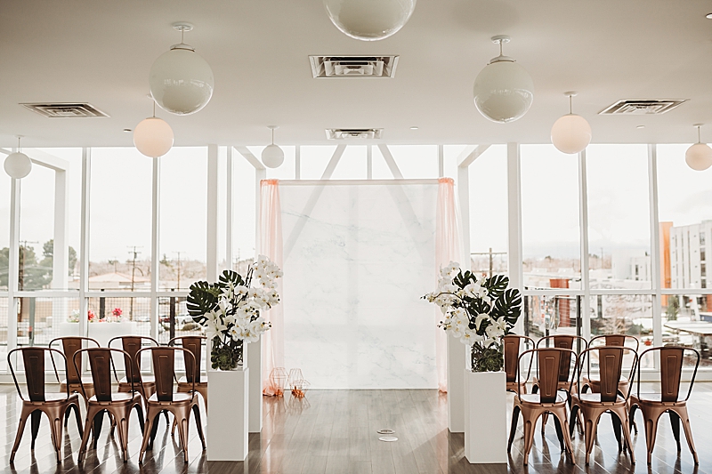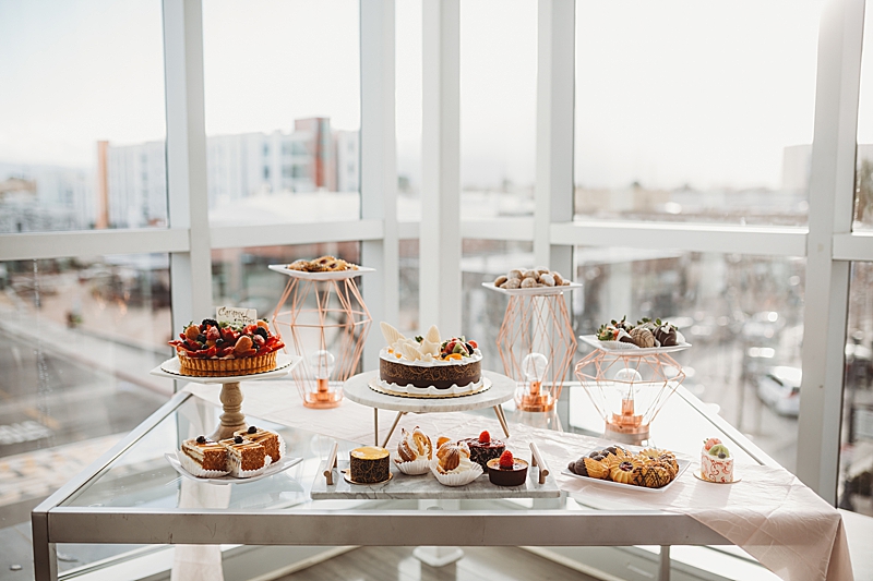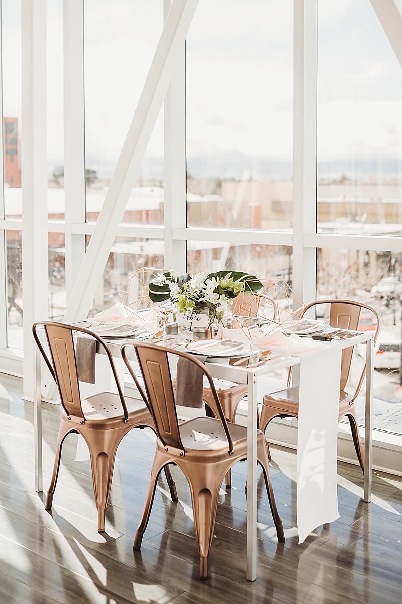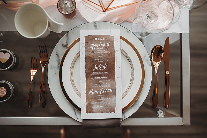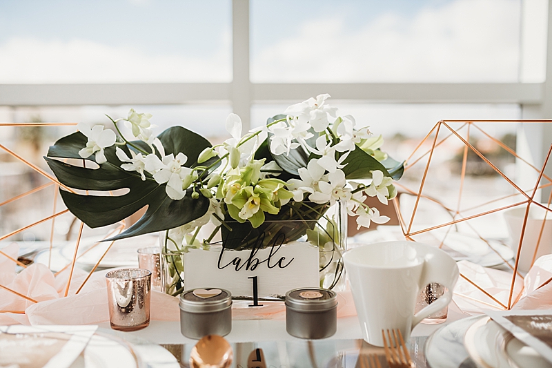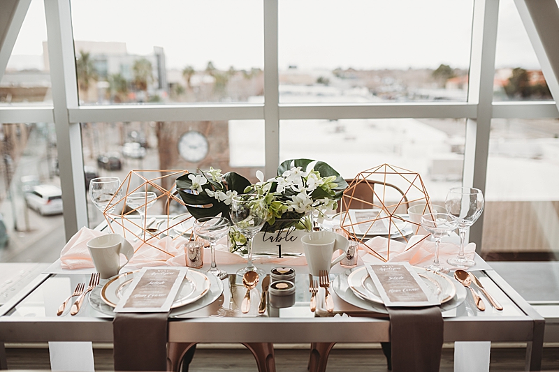 “Our Modern Romance shoot was designed to show our abilities to create outside of our comfort zone. We choose to have the shoot at the MOAH, Museum of Art History in the city of Lancaster. Its modern architecture delivers a dash of drama and crisp lines that will beautifully frame all of your happy memories. We incorporated a rose gold runner on a clear glass table. We used marble chargers, rose gold lined plates, and rose gold flatware. We placed 2 geometric rose gold decor pieces on each side of the orchid centerpiece and placed the acrylic table number in front which all blended beautifully. To add a special personal touch we included tea cups and tins filled with loose tea as thank you gifts. For the sweetheart table, the couple enjoyed their very own Mr. & Mrs. Teapots.“