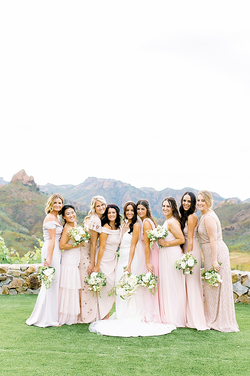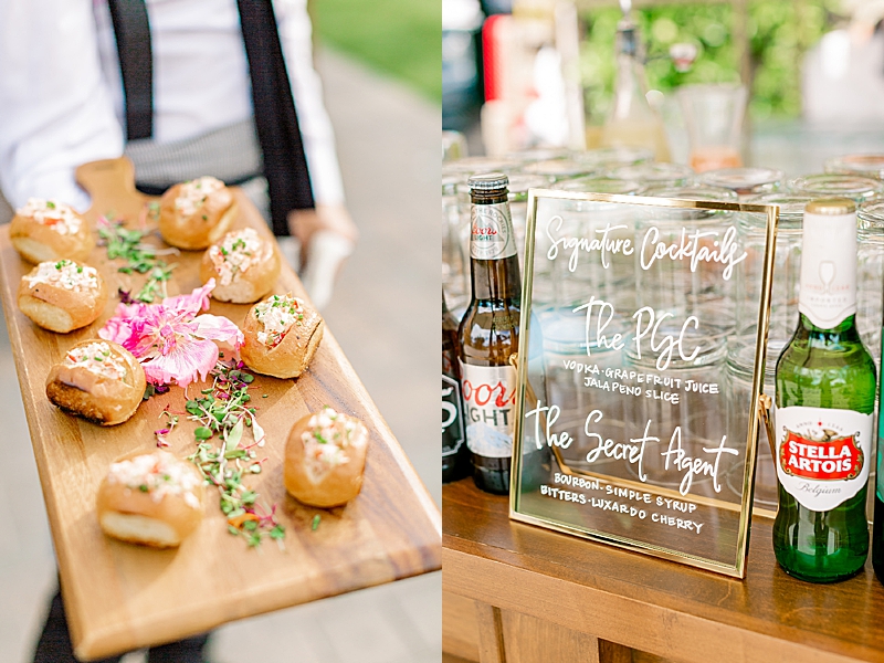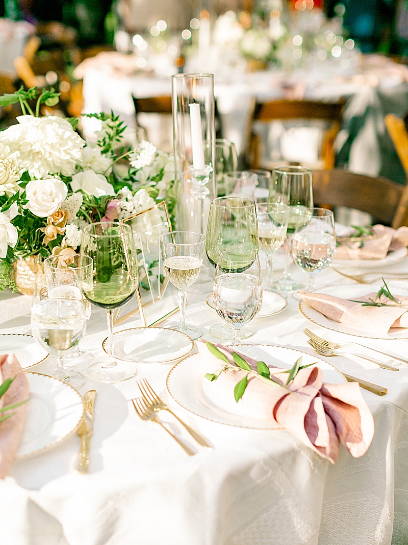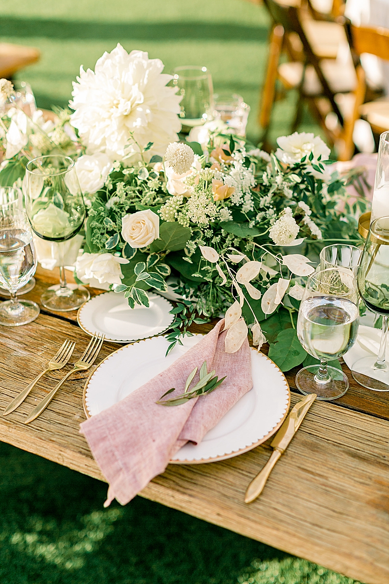 “I really knew what kind of style and vibe I wanted for my wedding from the minute I chose Cielo Farms as our venue; something classic, simple and elegant, but still had a unique look that really exemplified my husband and I’s style. I wanted very neutral blushes/pinks in terms of the color palette, with mostly all white flowers, and some clean white, yet unique linens. The venue has a rustic, Tuscan style, however, I wanted to tone out the wood and stone with lots of whites, creams and blushes in the colors, and clean modern lines in the arch that we chose for our ceremony. Then we had this really cool neon sign displaying “The Sullivans” behind the bar, which I thought was so unique and I loved it! We even named our specialty cocktails after Ben’s late grandfather (The Secret Agent after his FBI roots) and my dad (The PGC, his company’s acronym). When it came to my dress, I knew I wanted it to match my wedding’s overall style as well. Something I could look back on and say, “Wow! This is still pretty, fresh, but classically beautiful.” My mom and sister have such an eye for pulling things together that the final product was truly everything that I envisioned for my wedding. Our ceremony florals and arch by Penelope Pots were by far the best-crafted detail we had for the event. The circular arch with the staggered aisle and flowers was so incredible and such a special touch that she added. My white flowers with dashes of stone pink were EVERYTHING. One of my favorite things we did for my wedding was definitely the silent disco at the end of the night that we had incorporated with our DJ. That was by far the coolest and most unexpected event of our wedding and I think it really took the party to another level. I was absolutely blown away when I saw the whole thing come together! If I could give any bride to be some advice? Go with your gut. If you want something and you can monetarily make it happen, do it! You don’t want to regret not doing something you wanted. It’s your day! It goes by so fast, so take some time to pause and look at all the people that came together to celebrate your love. It really is the one time in your life that you’ll have everyone you want in one place celebrating you and your partner! All I wanted in our wedding was for our friends and family to be together all in one room having an amazing time celebrating our love. I wanted our wedding to be just as much of an incredible party as it would be a serious ceremony of commitment. Nothing truly mattered but my husband and I sharing this beautiful moment with our friends and family.” -bride