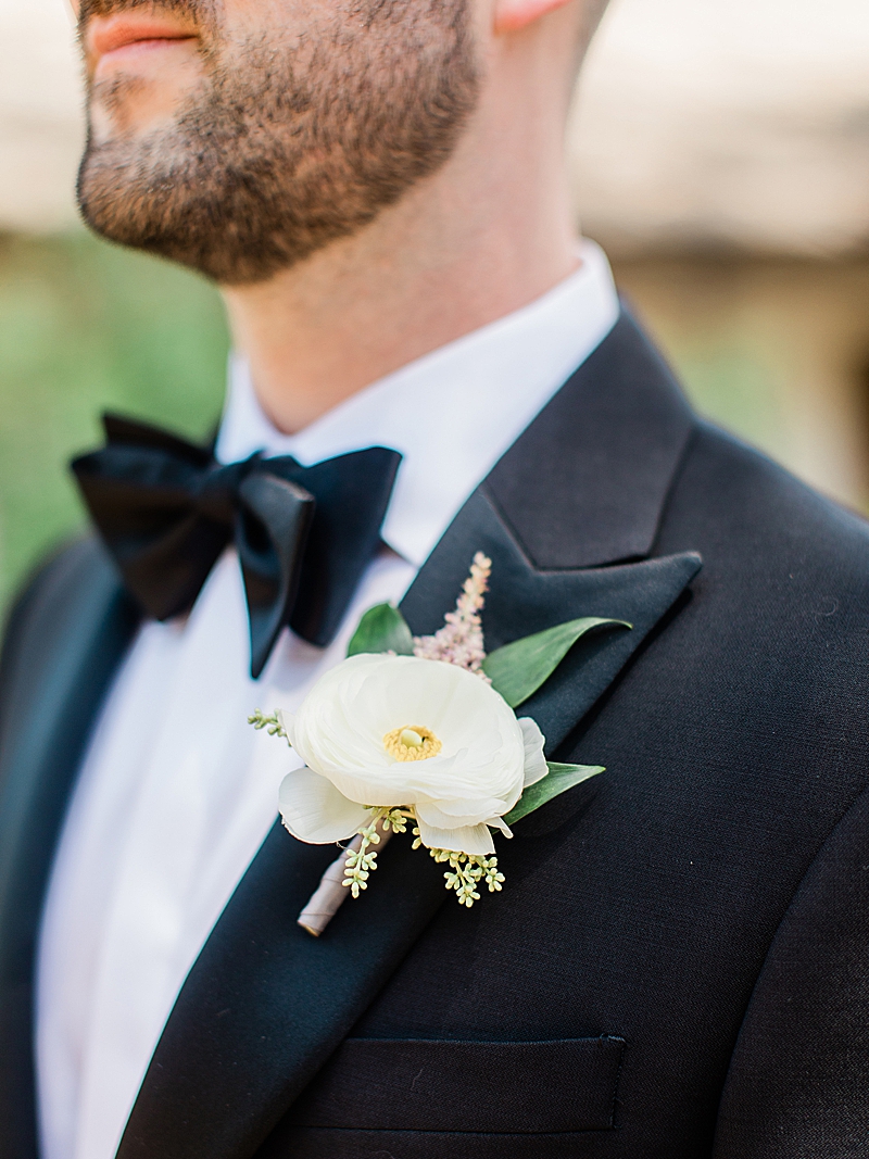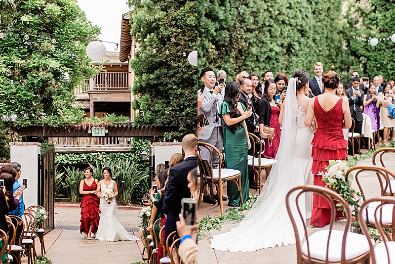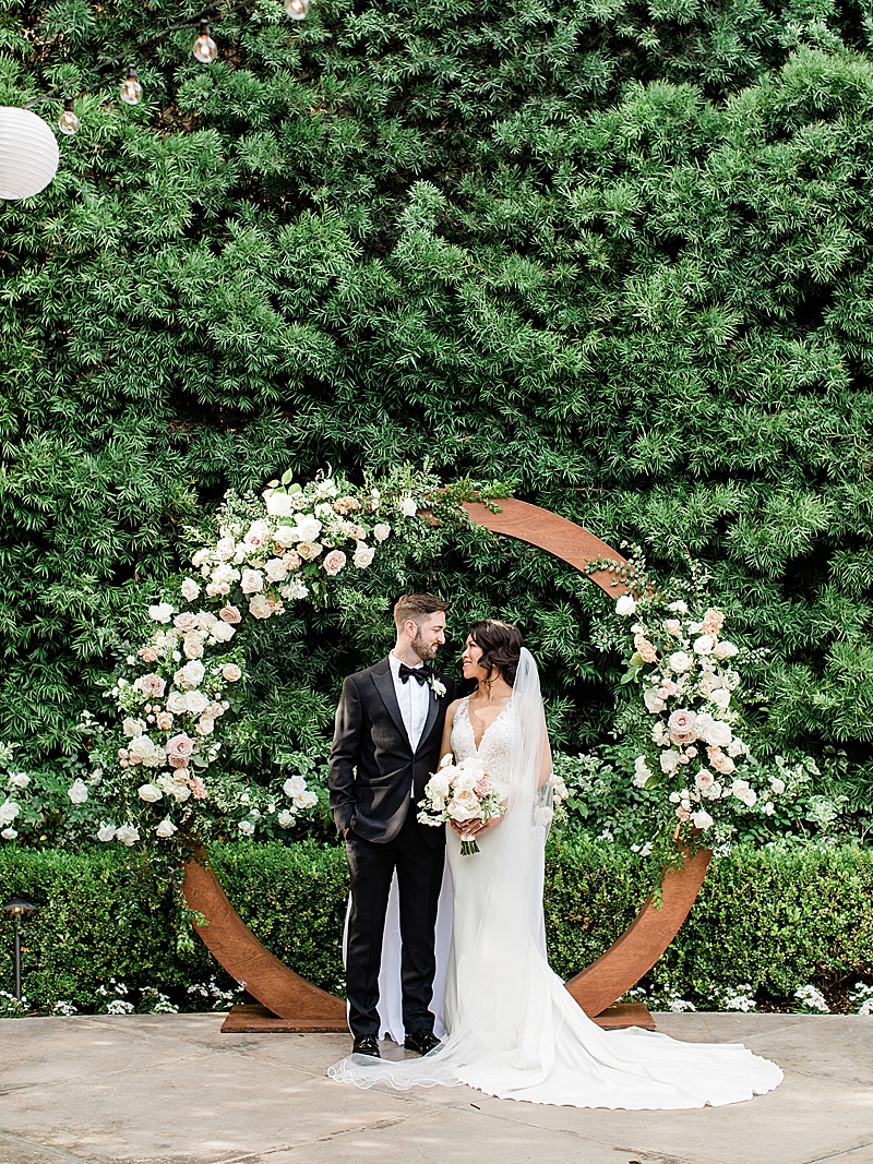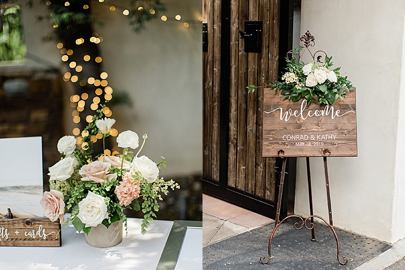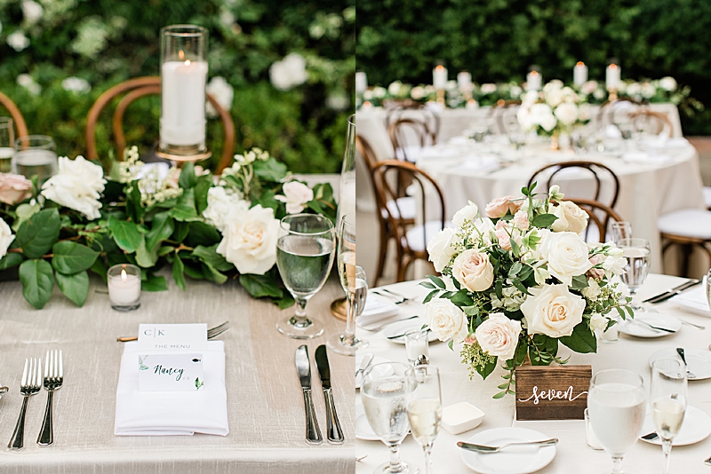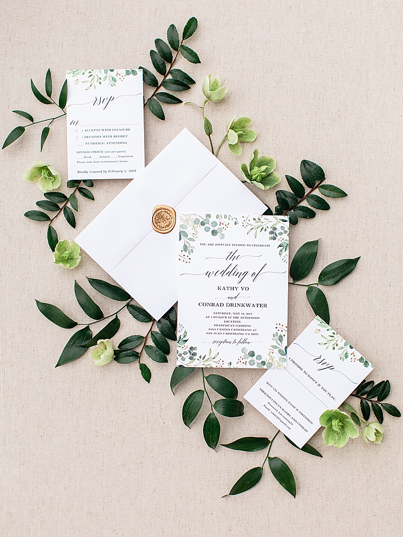 “Hidden in the quaint town of San Juan Capistrano is the lush grounds of Franciscan Gardens. Tall walls of greenery and small hedges of white roses surround the ceremony and reception space of this intimate venue, setting the perfect tone for Kathy & Conrad’s spring garden wedding. Flower Allie chose white ranunculus with cream and blush roses to contrast the natural greenery of the garden area. This choice was especially thoughtful with the infinity arch, which really popped out from the surrounding hedges. In the center of the infinity arch, the couple placed a photograph of the bride’s late father to honor him and so he could be at the center of their celebration. The wood of the arch matched the chairs perfectly to really complete the look of the ceremony setting. For their reception, the table decor alternated between flower runners with tall candles for the rectangular tables and circular centerpieces with short candles for the round tables. Wooden table numbers with white calligraphy completed the reception design. Guests were invited via a simple, yet elegant invitations designed by Vine Wedding. The couple chose a design with small greenery details, just like their garden venue. The envelopes were sealed with a classic gold stamp with the couple’s initials. Kathy stunned in a Pronovias dress while her bridesmaids wore blush. Conrad wore a classic black tux, while his groomsmen wore a dark gray. Their outfit choices together looked perfect for a spring garden wedding.”