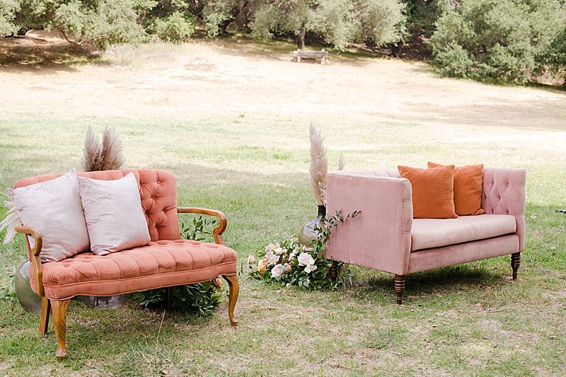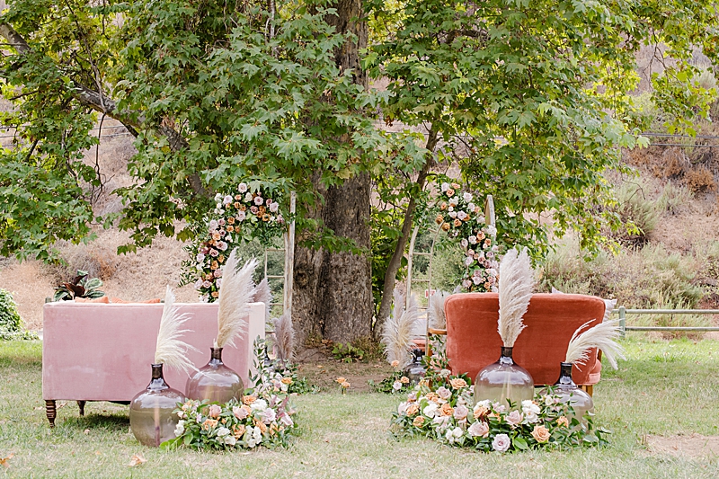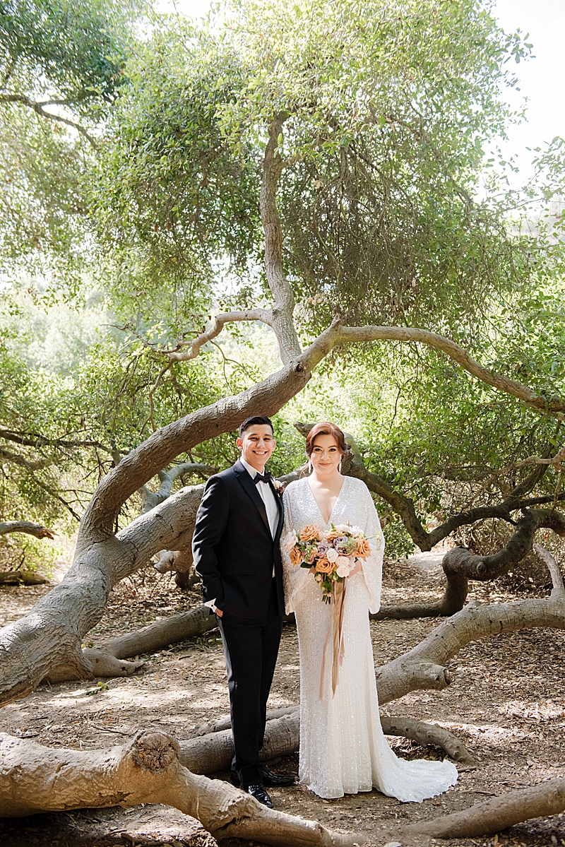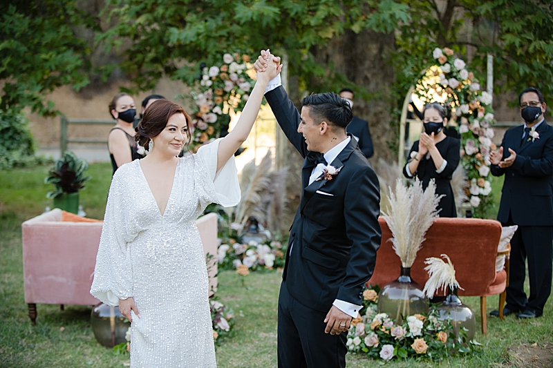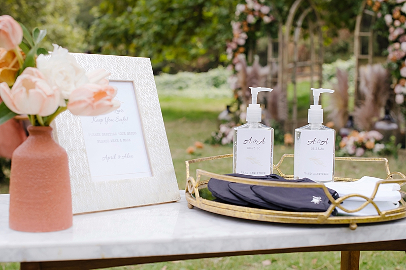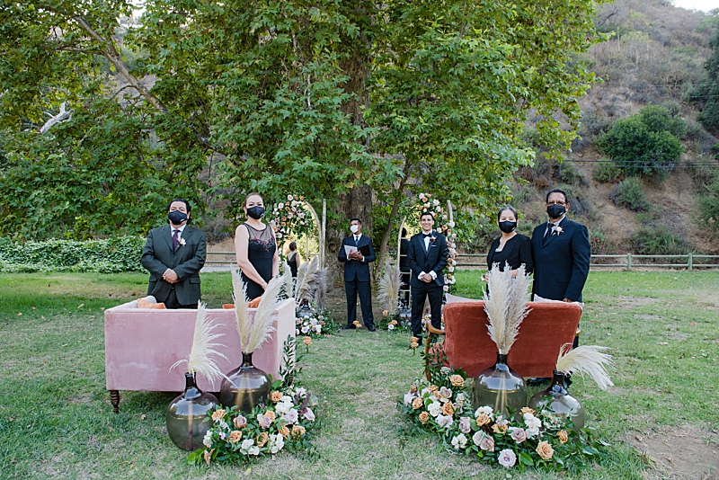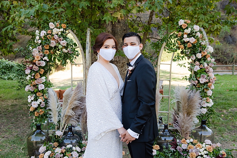 Concept, Design and Production: Yvonne Wolf Events | Location: Franklin Canyon Mountains, Recreation and Conservation Authority | Florals: Little Hill Floral Designs Specialty Rentals: Archive Rentals | Photography: Karina Pires Photography | Videography: Custom Made Productions | Petite Wedding Cake: Sweet E’s Bakeshop | Catering: Made by Meg Catering | Music: Mike Gerbrandt | Personalized Masks and Sanitizers: Studio 90212 | Officiant: Reverend Marlon Martinez